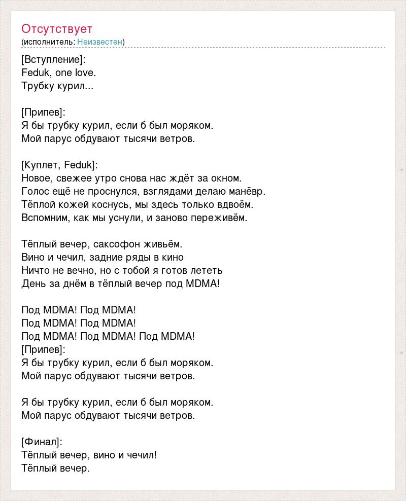 [Вступление]: Feduk, one love. Трубку курил... [Припев]: Я бы трубку курил, если б был моряком. Мой парус обдувают тысячи ветров. [Куплет, Feduk]: Новое, свежее утро снова нас ждёт за окном. Голос ещё не проснулся, взглядами делаю манёвр. Тёплой кожей коснусь, мы здесь только вдвоём. Вспомним, как мы уснули, и заново переживём. Тёплый вечер, саксофон живьём. Вино и чечил, задние ряды в кино Ничто не вечно, но с тобой я готов лететь День за днём в тёплый вечер под MDMA! Под MDMA! Под MDMA! Под MDMA! Под MDMA! Под MDMA! Под MDMA! Под MDMA! [Припев]: Я бы трубку курил, если б был моряком. Мой парус обдувают тысячи ветров. Я бы трубку курил, если б был моряком. Мой парус обдувают тысячи ветров. [Финал]: Тёплый вечер, вино и чечил! Тёплый вечер.