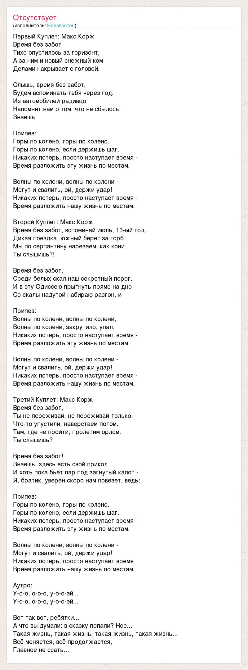 Первый Куплет: Макс Корж Время без забот Тихо опустилось за горизонт, А за ним и новый снежный ком Делами накрывает с головой. Слышь, время без забот, Будем вспоминать тебя через год. Из автомобилей радивцо Напомнит нам о том, что не сбылось. Знаешь Припев: Горы по колено, горы по колено. Горы по колено, если держишь шаг. Никаких потерь, просто наступает время - Время разложить эту жизнь по местам. Волны по колени, волны по колени - Могут и свалить, ой, держи удар! Никаких потерь, просто наступает время - Время разложить нашу жизнь по местам. Второй Куплет: Макс Корж Время без забот, вспоминай июль, 13-ый год. Дикая поездка, южный берег за горб. Мы по серпантину нарезаем, как кони. Ты слышишь?! Время без забот, Среди белых скал наш секретный порог. И в эту Одиссею прыгнуть прямо на дно Со скалы надутой набираю разгон, и - Припев: Волны по колени, волны по колени, Волны по колени, закрутило, упал. Никаких потерь, просто наступает время - Время разложить эту жизнь по местам. Волны по колени, волны по колени - Могут и свалить, ой, держи удар! Никаких потерь, просто наступает время - Время разложить нашу жизнь по местам. Третий Куплет: Макс Корж Время без забот, Ты не переживай, не переживай-только. Что-то упустили, наверстаем потом. Там, где не пройти, пролетим орлом. Ты слышишь? Время без забот! Знаешь, здесь есть свой прикол. И хоть пока бьёт пар под загнутый капот - Я, братик, уверен скоро нам повезет, ведь: Припев: Горы по колено, горы по колено. Горы по колено, если держишь шаг. Никаких потерь, просто наступает время - Время разложить эту жизнь по местам. Волны по колени, волны по колени - Могут и свалить, ой, держи удар! Никаких потерь, просто наступает время Время разложить нашу жизнь по местам. Аутро: У-о-о, о-о-о, у-о-о-эй... У-о-о, о-о-о, у-о-о-эй... Вот так вот, ребятки... А что вы думали: в сказку попали? Нее... Такая жизнь, такая жизнь, такая жизнь, такая жизнь... Всё меняется, всё продолжается, Главное не ссать...