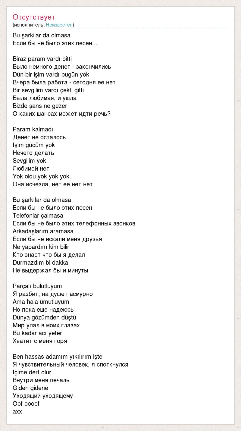 Bu şarkilar da olmasa Если бы не было этих песен... Biraz param vardı bitti Было немного денег - закончились Dün bir işim vardı bugün yok Вчера была работа - сегодня ее нет Bir sevgilim vardı çekti gitti Была любимая, и ушла Bizde şans ne gezer О каких шансах может идти речь? Param kalmadı Денег не осталось Işim gücüm yok Нечего делать Sevgilim yok Любимой нет Yok oldu yok yok yok.. Она исчезла, нет ее нет нет Bu şarkılar da olmasa Если бы не было этих песен Telefonlar çalmasa Если бы не было этих телефонных звонков Arkadaşlarım aramasa Если бы не искали меня друзья Ne yapardım kim bilir Кто знает что бы я делал Durmazdım bi dakka Не выдержал бы и минуты Parçalı bulutluyum Я разбит, на душе пасмурно Ama hala umutluyum Но пока еще надеюсь Dünya gözümden düştü Мир упал в моих глазах Bu kadar acı yeter Хватит с меня горя Ben hassas adamım yıkılırım işte Я чувствительный человек, я споткнулся Içime dert olur Внутри меня печаль Giden gidene Уходящий уходящему Oof oooof ахх