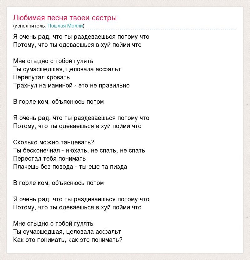 Я очень рад, что ты раздеваешься потому что Потому, что ты одеваешься в хуй пойми что Мне стыдно с тобой гулять Ты сумасшедшая, целовала асфальт Перепутал кровать Трахнул на маминой - это не правильно В горле ком, объяснюсь потом Я очень рад, что ты раздеваешься потому что Потому, что ты одеваешься в хуй пойми что Сколько можно танцевать? Ты бесконечная - нюхать, не спать, не спать Перестал тебя понимать Плачешь без повода - ты еще та пизда В горле ком, объяснюсь потом Я очень рад, что ты раздеваешься потому что Потому, что ты одеваешься в хуй пойми что Мне стыдно с тобой гулять Ты сумасшедшая, целовала асфальт Как это понимать, как это понимать?