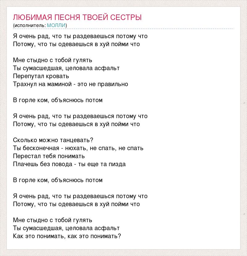Я очень рад, что ты раздеваешься потому что Потому, что ты одеваешься в хуй пойми что Мне стыдно с тобой гулять Ты сумасшедшая, целовала асфальт Перепутал кровать Трахнул на маминой - это не правильно В горле ком, объяснюсь потом Я очень рад, что ты раздеваешься потому что Потому, что ты одеваешься в хуй пойми что Сколько можно танцевать? Ты бесконечная - нюхать, не спать, не спать Перестал тебя понимать Плачешь без повода - ты еще та пизда В горле ком, объяснюсь потом Я очень рад, что ты раздеваешься потому что Потому, что ты одеваешься в хуй пойми что Мне стыдно с тобой гулять Ты сумасшедшая, целовала асфальт Как это понимать, как это понимать?