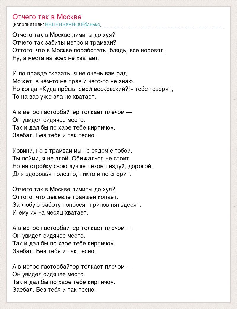 Отчего так в Москве лимиты до хуя? Отчего так забиты метро и трамваи? Оттого, что в Москве поработать, блядь, все норовят, Ну, а места на всех не хватает. И по правде сказать, я не очень вам рад. Может, в чём-то не прав и чего-то не знаю. Но когда «Куда прёшь, змей московский?!» тебе говорят, То на вас уже зла не хватает. А в метро гасторбайтер толкает плечом — Он увидел сидячее место. Так и дал бы по харе тебе кирпичом. Заебал. Без тебя и так тесно. Извини, но в трамвай мы не сядем с тобой. Ты пойми, я не злой. Обижаться не стоит. Но на стройку свою лучше пёхом пиздуй, дорогой. Для здоровья полезно, никто и не спорит. Отчего так в Москве лимиты до хуя? Оттого, что дешевле траншеи копает. За любую работу попросят гринов пятьдесят. И ему их на месяц хватает. А в метро гасторбайтер толкает плечом — Он увидел сидячее место. Так и дал бы по харе тебе кирпичом. Заебал. Без тебя и так тесно. А в метро гасторбайтер толкает плечом — Он увидел сидячее место. Так и дал бы по харе тебе кирпичом. Заебал. Без тебя и так тесно.