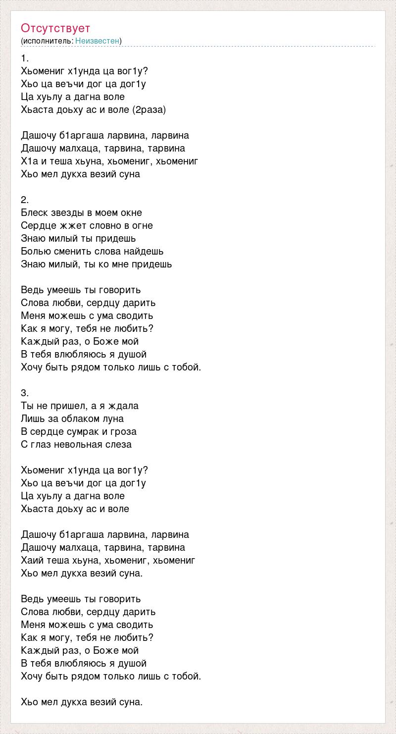 1. Хьомениг х1унда ца вог1у? Хьо ца веъчи дог ца дог1у Ца хуьлу а дагна воле Хьаста доьху ас и воле (2раза) Дашочу б1аргаша ларвина, ларвина Дашочу малхаца, тарвина, тарвина Х1а и теша хьуна, хьомениг, хьомениг Хьо мел дукха везий суна 2. Блеск звезды в моем окне Сердце жжет словно в огне Знаю милый ты придешь Болью сменить слова найдешь Знаю милый, ты ко мне придешь Ведь умеешь ты говорить Слова любви, сердцу дарить Меня можешь с ума сводить Как я могу, тебя не любить? Каждый раз, о Боже мой В тебя влюбляюсь я душой Хочу быть рядом только лишь с тобой. 3. Ты не пришел, а я ждала Лишь за облаком луна В сердце сумрак и гроза С глаз невольная слеза Хьомениг х1унда ца вог1у? Хьо ца веъчи дог ца дог1у Ца хуьлу а дагна воле Хьаста доьху ас и воле Дашочу б1аргаша ларвина, ларвина Дашочу малхаца, тарвина, тарвина Хаий теша хьуна, хьомениг, хьомениг Хьо мел дукха везий суна. Ведь умеешь ты говорить Слова любви, сердцу дарить Меня можешь с ума сводить Как я могу, тебя не любить? Каждый раз, о Боже мой В тебя влюбляюсь я душой Хочу быть рядом только лишь с тобой. Хьо мел дукха везий суна.