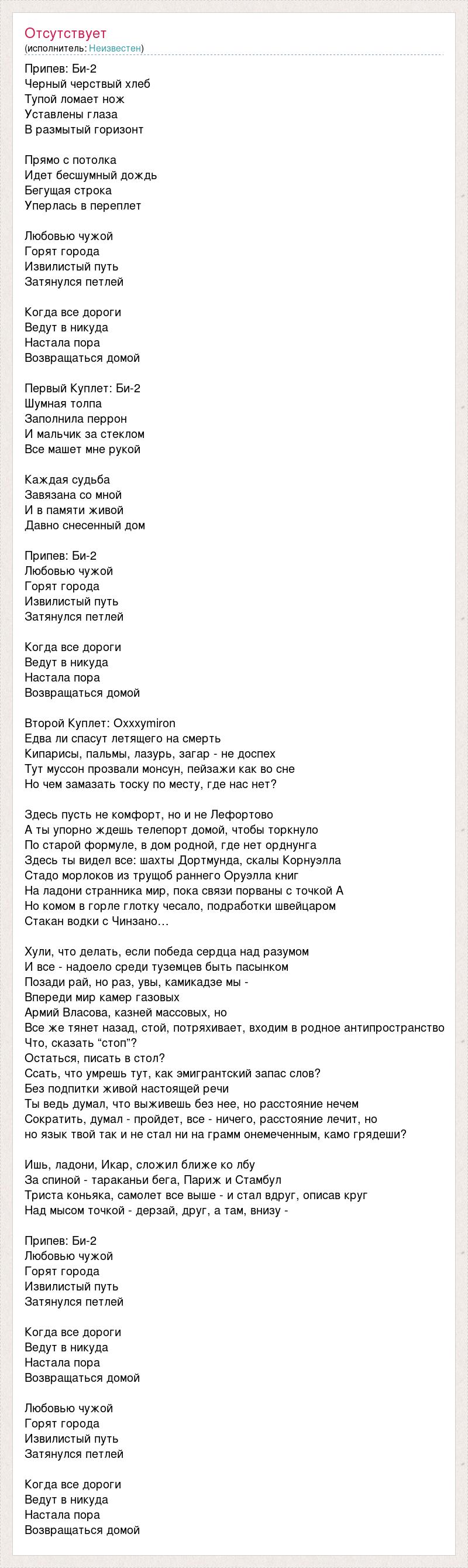 Припев: Би-2 Черный черствый хлеб Тупой ломает нож Уставлены глаза В размытый горизонт Прямо с потолка Идет бесшумный дождь Бегущая строка Уперлась в переплет Любовью чужой Горят города Извилистый путь Затянулся петлей Когда все дороги Ведут в никуда Настала пора Возвращаться домой Первый Куплет: Би-2 Шумная толпа Заполнила перрон И мальчик за стеклом Все машет мне рукой Каждая судьба Завязана со мной И в памяти живой Давно снесенный дом Припев: Би-2 Любовью чужой Горят города Извилистый путь Затянулся петлей Когда все дороги Ведут в никуда Настала пора Возвращаться домой Второй Куплет: Oxxxymiron Едва ли спасут летящего на смерть Кипарисы, пальмы, лазурь, загар - не доспех Тут муссон прозвали монсун, пейзажи как во сне Но чем замазать тоску по месту, где нас нет? Здесь пусть не комфорт, но и не Лефортово А ты упорно ждешь телепорт домой, чтобы торкнуло По старой формуле, в дом родной, где нет орднунга Здесь ты видел все: шахты Дортмунда, скалы Корнуэлла Стадо морлоков из трущоб раннего Оруэлла книг На ладони странника мир, пока связи порваны с точкой А Но комом в горле глотку чесало, подработки швейцаром Стакан водки с Чинзано… Хули, что делать, если победа сердца над разумом И все - надоело среди туземцев быть пасынком Позади рай, но раз, увы, камикадзе мы - Впереди мир камер газовых Армий Власова, казней массовых, но Все же тянет назад, стой, потряхивает, входим в родное антипространство Что, сказать “стоп”? Остаться, писать в стол? Ссать, что умрешь тут, как эмигрантский запас слов? Без подпитки живой настоящей речи Ты ведь думал, что выживешь без нее, но расстояние нечем Сократить, думал - пройдет, все - ничего, расстояние лечит, но но язык твой так и не стал ни на грамм онемеченным, камо грядеши? Ишь, ладони, Икар, сложил ближе ко лбу За спиной - тараканьи бега, Париж и Стамбул Триста коньяка, самолет все выше - и стал вдруг, описав круг Над мысом точкой - дерзай, друг, а там, внизу - Припев: Би-2 Любовью чужой Горят города Извилистый путь Затянулся петлей Когда все дороги Ведут в никуда Настала пора Возвращаться домой Любовью чужой Горят города Извилистый путь Затянулся петлей Когда все дороги Ведут в никуда Настала пора Возвращаться домой
