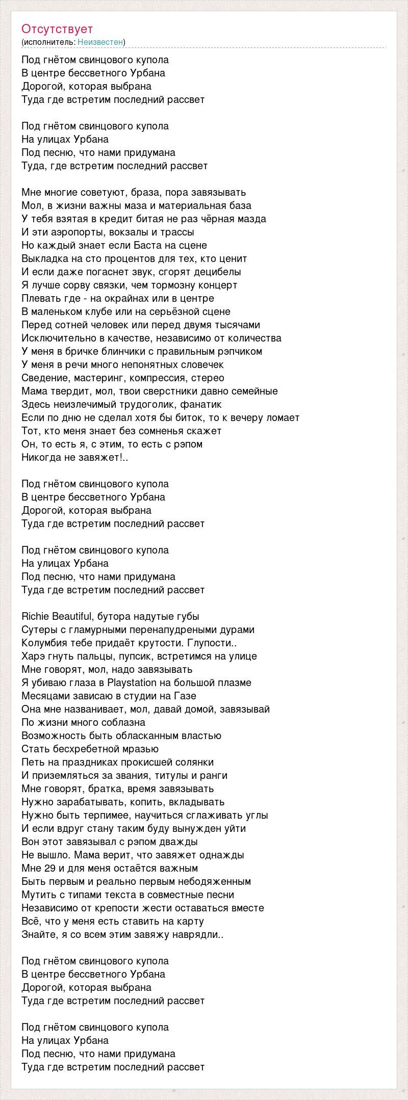 Под гнётом свинцового купола В центре бессветного Урбана Дорогой, которая выбрана Туда где встретим последний рассвет Под гнётом свинцового купола На улицах Урбана Под песню, что нами придумана Туда, где встретим последний рассвет Мне многие советуют, браза, пора завязывать Мол, в жизни важны маза и материальная база У тебя взятая в кредит битая не раз чёрная мазда И эти аэропорты, вокзалы и трассы Но каждый знает если Баста на сцене Выкладка на сто процентов для тех, кто ценит И если даже погаснет звук, сгорят децибелы Я лучше сорву связки, чем тормозну концерт Плевать где - на окрайнах или в центре В маленьком клубе или на серьёзной сцене Перед сотней человек или перед двумя тысячами Исключительно в качестве, независимо от количества У меня в бричке блинчики с правильным рэпчиком У меня в речи много непонятных словечек Сведение, мастеринг, компрессия, стерео Мама твердит, мол, твои сверстники давно семейные Здесь неизлечимый трудоголик, фанатик Если по дню не сделал хотя бы биток, то к вечеру ломает Тот, кто меня знает без сомненья скажет Он, то есть я, с этим, то есть с рэпом Никогда не завяжет!.. Под гнётом свинцового купола В центре бессветного Урбана Дорогой, которая выбрана Туда где встретим последний рассвет Под гнётом свинцового купола На улицах Урбана Под песню, что нами придумана Туда где встретим последний рассвет Richie Beautiful, бутора надутые губы Сутеры с гламурными перенапудреными дурами Колумбия тебе придаёт крутости. Глупости.. Харэ гнуть пальцы, пупсик, встретимся на улице Мне говорят, мол, надо завязывать Я убиваю глаза в Playstation на большой плазме Месяцами зависаю в студии на Газе Она мне названивает, мол, давай домой, завязывай По жизни много соблазна Возможность быть обласканным властью Стать бесхребетной мразью Петь на праздниках прокисшей солянки И приземляться за звания, титулы и ранги Мне говорят, братка, время завязывать Нужно зарабатывать, копить, вкладывать Нужно быть терпимее, научиться сглаживать углы И если вдруг стану таким буду вынужден уйти Вон этот завязывал с рэпом дважды Не вышло. Мама верит, что завяжет однажды Мне 29 и для меня остаётся важным Быть первым и реально первым небодяженным Мутить с типами текста в совместные песни Независимо от крепости жести оставаться вместе Всё, что у меня есть ставить на карту Знайте, я со всем этим завяжу наврядли.. Под гнётом свинцового купола В центре бессветного Урбана Дорогой, которая выбрана Туда где встретим последний рассвет Под гнётом свинцового купола На улицах Урбана Под песню, что нами придумана Туда где встретим последний рассвет