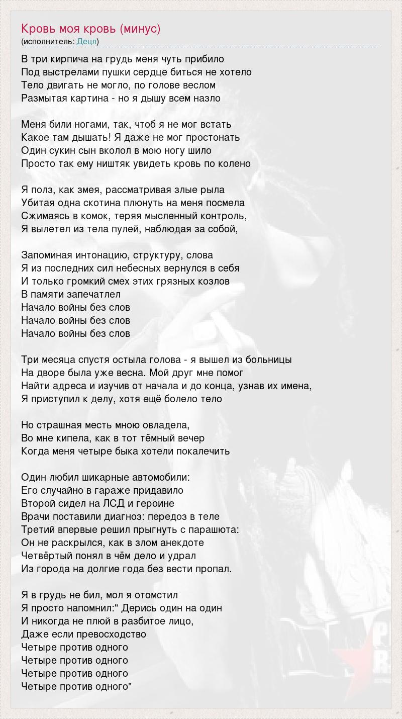 В три кирпича на грудь меня чуть прибило Под выстрелами пушки сердце биться не хотело Тело двигать не могло, по голове веслом Размытая картина - но я дышу всем назло Меня били ногами, так, чтоб я не мог встать Какое там дышать! Я даже не мог простонать Один сукин сын вколол в мою ногу шило Просто так ему ништяк увидеть кровь по колено Я полз, как змея, рассматривая злые рыла Убитая одна скотина плюнуть на меня посмела Сжимаясь в комок, теряя мысленный контроль, Я вылетел из тела пулей, наблюдая за собой, Запоминая интонацию, структуру, слова Я из последних сил небесных вернулся в себя И только громкий смех этих грязных козлов В памяти запечатлел Начало войны без слов Начало войны без слов Начало войны без слов Три месяца спустя остыла голова - я вышел из больницы На дворе была уже весна. Мой друг мне помог Найти адреса и изучив от начала и до конца, узнав их имена, Я приступил к делу, хотя ещё болело тело Но страшная месть мною овладела, Во мне кипела, как в тот тёмный вечер Когда меня четыре быка хотели покалечить Один любил шикарные автомобили: Его случайно в гараже придавило Второй сидел на ЛСД и героине Врачи поставили диагноз: передоз в теле Третий впервые решил прыгнуть с парашюта: Он не раскрылся, как в злом анекдоте Четвёртый понял в чём дело и удрал Из города на долгие года без вести пропал. Я в грудь не бил, мол я отомстил Я просто напомнил:" Дерись один на один И никогда не плюй в разбитое лицо, Даже если превосходство Четыре против одного Четыре против одного Четыре против одного Четыре против одного"