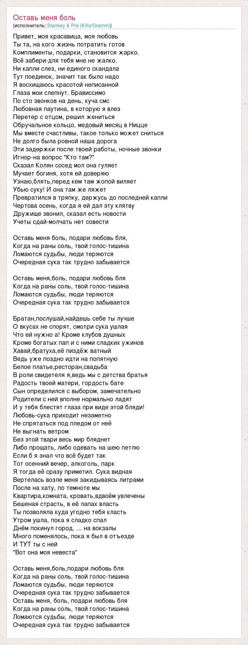 Привет, моя красавица, моя любовь Ты та, на кого жизнь потратить готов Комплименты, подарки, становится жарко. Всё забери-для тебя мне не жалко. Ни капли слез, ни единого скандала Тут поединок, значит так было надо Я восхищаюсь красотой неписанной Глаза мои слепнут. Брависсимо По сто звонков на день, куча смс Любовная паутина, в которую я влез Перетер с отцом, решил жениться Обручальное кольцо, медовый месяц в Ницце Мы вместе счастливы, такое только может сниться Не долго была ровной наша дорога Эти задержки после твоей работы, ночные звонки Игнор-на вопрос "Кто там?" Сказал Колян сосед мол она гуляет Мучает богиня, хотя ей доверяю Узнаю,блять,перед кем там жопой виляет Убью суку! И она там же ляжет Превратился в тряпку, держусь до последней капли Чертова осень, когда я ей дал эту клятву Дружище звонил, сказал есть новости Учеты сдай-молчать нет совести Оставь меня боль, подари любовь бля, Когда на раны соль, твой голос-тишина Ломаются судьбы, люди теряются Очередная сука так трудно забывается Оставь меня,боль, подари любовь бля Когда на раны соль, твой голос-тишина Ломаются судьбы, люди теряются Очередная сука так трудно забывается Братан,послушай,найдешь себе ты лучше О вкусах не спорят, смотри сука ушлая Что ей нужно а! Кроме клубов душных Кроме богатых пап и с ними сладких ужинов Хавай,братуха,её пиздёж ватный Ведь уже поздно идти на попятную Белое платье,ресторан,свадьба В роли свидетеля я,ведь мы с детства братья Радость твоей матери, гордость бате Сын определился с выбором, замечательно Родители с ней вполне нормально ладят И у тебя блестят глаза при виде этой бляди! Любовь-сука приходит незаметно Не спрятаться под пледом от неё Не выгнать ветром Без этой твари весь мир бляднет Либо прощать, либо одевать на шею петлю Если б я знал что всё будет так Тот осенний вечер, алкоголь, парк Я тогда её сразу приметил. Сука видная Вертелась возле меня закидываясь литрами После на хату, по темноте мы Квартира,комната, кровать,вдвоём увлечены Бешеная страсть, в её лапах власть Ты позволяла куда угодно тебя класть Утром ушла, пока я сладко спал Днём покинул город, ... на вокзалы Много поменялось, пока я был в отъезде И ТУТ ты с ней "Вот она моя невеста" Оставь меня,боль,подари любовь бля Когда на раны соль, твой голос-тишина Ломаются судьбы, люди теряются Очередная сука так трудно забывается Оставь меня, боль, подари любовь бля Когда на раны соль, твой голос-тишина Ломаются судьбы, люди теряются Очередная сука так трудно забывается