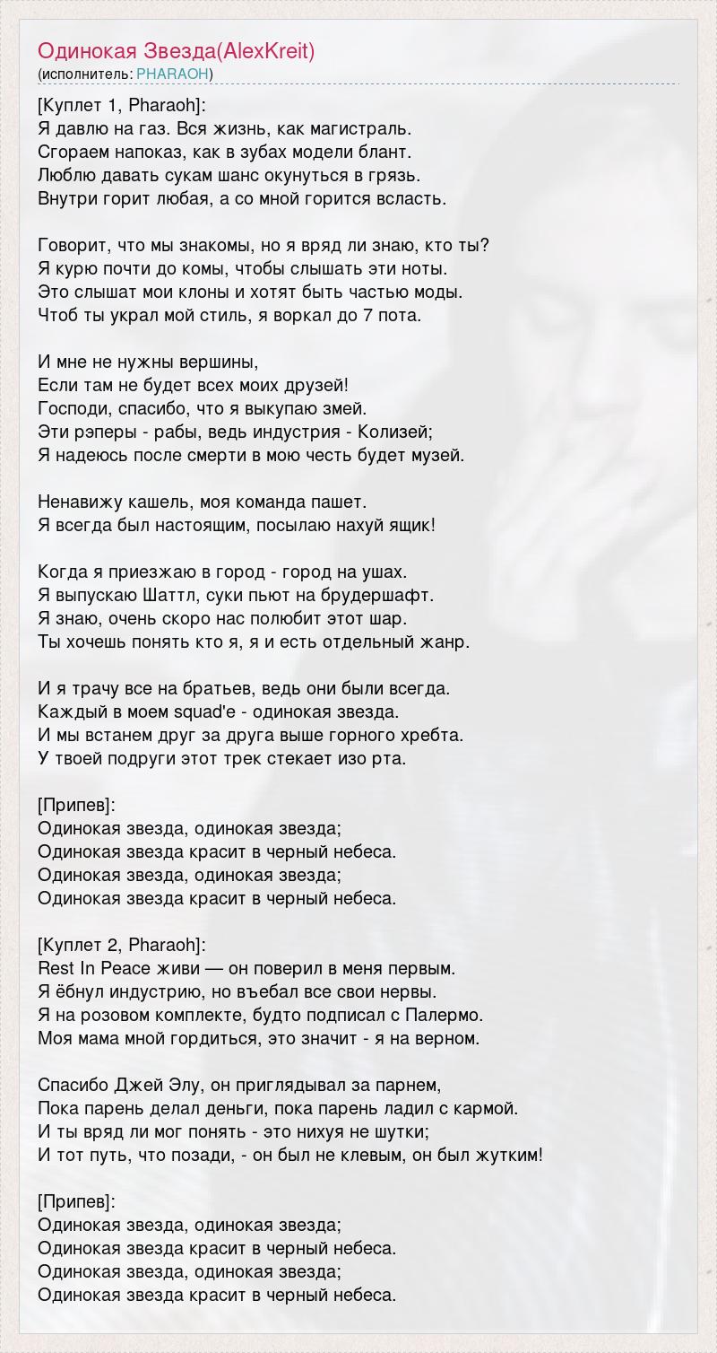[Куплет 1, Pharaoh]: Я давлю на газ. Вся жизнь, как магистраль. Сгораем напоказ, как в зубах модели блант. Люблю давать сукам шанс окунуться в грязь. Внутри горит любая, а со мной горится всласть. Говорит, что мы знакомы, но я вряд ли знаю, кто ты? Я курю почти до комы, чтобы слышать эти ноты. Это слышат мои клоны и хотят быть частью моды. Чтоб ты украл мой стиль, я воркал до 7 пота. И мне не нужны вершины, Если там не будет всех моих друзей! Господи, спасибо, что я выкупаю змей. Эти рэперы - рабы, ведь индустрия - Колизей; Я надеюсь после смерти в мою честь будет музей. Ненавижу кашель, моя команда пашет. Я всегда был настоящим, посылаю нахуй ящик! Когда я приезжаю в город - город на ушах. Я выпускаю Шаттл, суки пьют на брудершафт. Я знаю, очень скоро нас полюбит этот шар. Ты хочешь понять кто я, я и есть отдельный жанр. И я трачу все на братьев, ведь они были всегда. Каждый в моем squad'е - одинокая звезда. И мы встанем друг за друга выше горного хребта. У твоей подруги этот трек стекает изо рта. [Припев]: Одинокая звезда, одинокая звезда; Одинокая звезда красит в черный небеса. Одинокая звезда, одинокая звезда; Одинокая звезда красит в черный небеса. [Куплет 2, Pharaoh]: Rest In Peace живи — он поверил в меня первым. Я ёбнул индустрию, но въебал все свои нервы. Я на розовом комплекте, будто подписал с Палермо. Моя мама мной гордиться, это значит - я на верном. Спасибо Джей Элу, он приглядывал за парнем, Пока парень делал деньги, пока парень ладил с кармой. И ты вряд ли мог понять - это нихуя не шутки; И тот путь, что позади, - он был не клевым, он был жутким! [Припев]: Одинокая звезда, одинокая звезда; Одинокая звезда красит в черный небеса. Одинокая звезда, одинокая звезда; Одинокая звезда красит в черный небеса.