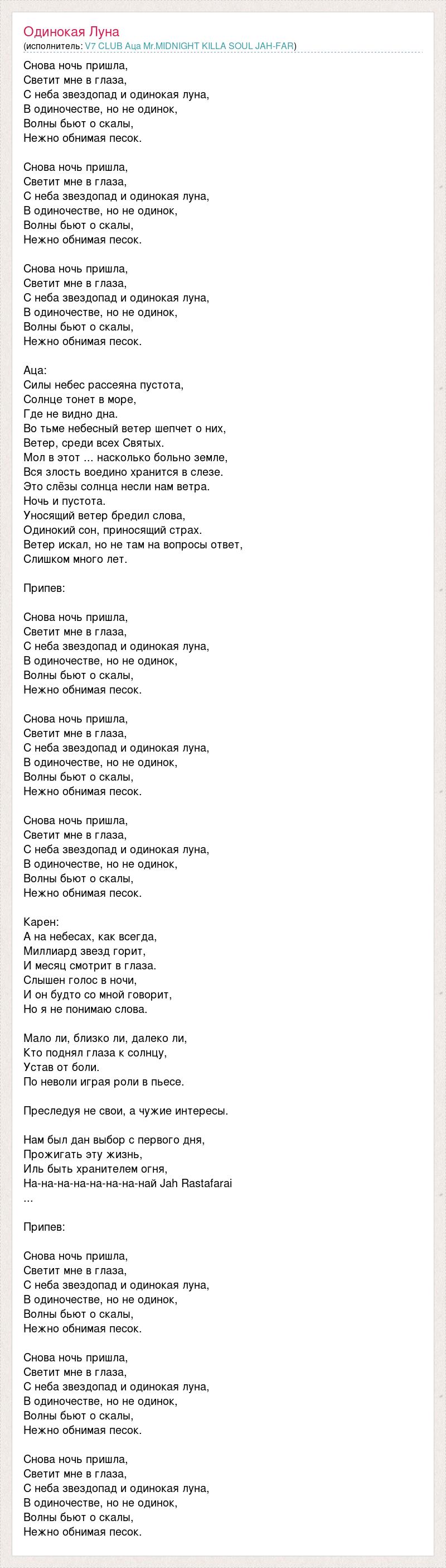 Снова ночь пришла, Светит мне в глаза, С неба звездопад и одинокая луна, В одиночестве, но не одинок, Волны бьют о скалы, Нежно обнимая песок. Снова ночь пришла, Светит мне в глаза, С неба звездопад и одинокая луна, В одиночестве, но не одинок, Волны бьют о скалы, Нежно обнимая песок. Снова ночь пришла, Светит мне в глаза, С неба звездопад и одинокая луна, В одиночестве, но не одинок, Волны бьют о скалы, Нежно обнимая песок. Аца: Силы небес рассеяна пустота, Солнце тонет в море, Где не видно дна. Во тьме небесный ветер шепчет о них, Ветер, среди всех Святых. Мол в этот ... насколько больно земле, Вся злость воедино хранится в слезе. Это слёзы солнца несли нам ветра. Ночь и пустота. Уносящий ветер бредил слова, Одинокий сон, приносящий страх. Ветер искал, но не там на вопросы ответ, Слишком много лет. Припев: Снова ночь пришла, Светит мне в глаза, С неба звездопад и одинокая луна, В одиночестве, но не одинок, Волны бьют о скалы, Нежно обнимая песок. Снова ночь пришла, Светит мне в глаза, С неба звездопад и одинокая луна, В одиночестве, но не одинок, Волны бьют о скалы, Нежно обнимая песок. Снова ночь пришла, Светит мне в глаза, С неба звездопад и одинокая луна, В одиночестве, но не одинок, Волны бьют о скалы, Нежно обнимая песок. Карен: А на небесах, как всегда, Миллиард звезд горит, И месяц смотрит в глаза. Слышен голос в ночи, И он будто со мной говорит, Но я не понимаю слова. Мало ли, близко ли, далеко ли, Кто поднял глаза к солнцу, Устав от боли. По неволи играя роли в пьесе. Преследуя не свои, а чужие интересы. Нам был дан выбор с первого дня, Прожигать эту жизнь, Иль быть хранителем огня, На-на-на-на-на-на-на-най Jah Rastafarai ... Припев: Снова ночь пришла, Светит мне в глаза, С неба звездопад и одинокая луна, В одиночестве, но не одинок, Волны бьют о скалы, Нежно обнимая песок. Снова ночь пришла, Светит мне в глаза, С неба звездопад и одинокая луна, В одиночестве, но не одинок, Волны бьют о скалы, Нежно обнимая песок. Снова ночь пришла, Светит мне в глаза, С неба звездопад и одинокая луна, В одиночестве, но не одинок, Волны бьют о скалы, Нежно обнимая песок.