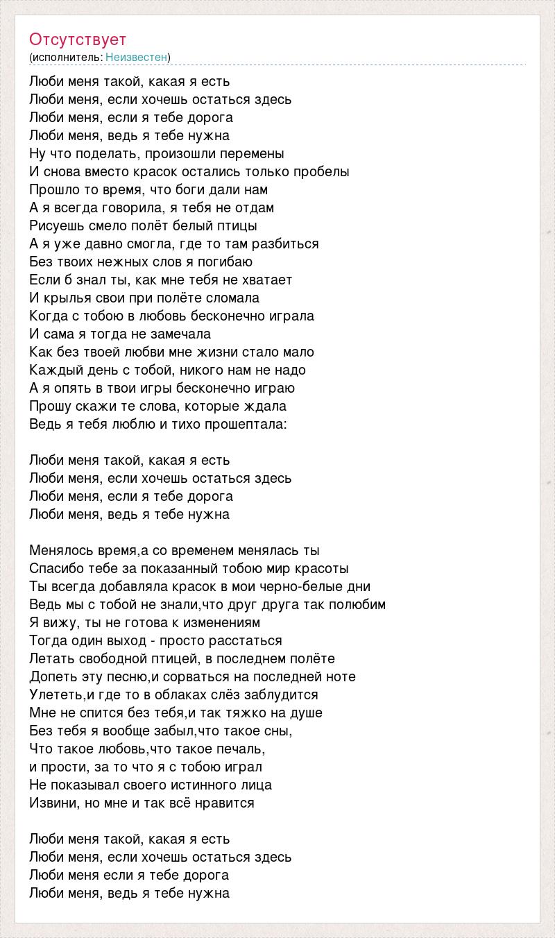 Люби меня такой, какая я есть Люби меня, если хочешь остаться здесь Люби меня, если я тебе дорога Люби меня, ведь я тебе нужна Ну что поделать, произошли перемены И снова вместо красок остались только пробелы Прошло то время, что боги дали нам А я всегда говорила, я тебя не отдам Рисуешь смело полёт белый птицы А я уже давно смогла, где то там разбиться Без твоих нежных слов я погибаю Если б знал ты, как мне тебя не хватает И крылья свои при полёте сломала Когда с тобою в любовь бесконечно играла И сама я тогда не замечала Как без твоей любви мне жизни стало мало Каждый день с тобой, никого нам не надо А я опять в твои игры бесконечно играю Прошу скажи те слова, которые ждала Ведь я тебя люблю и тихо прошептала: Люби меня такой, какая я есть Люби меня, если хочешь остаться здесь Люби меня, если я тебе дорога Люби меня, ведь я тебе нужна Менялось время,а со временем менялась ты Спасибо тебе за показанный тобою мир красоты Ты всегда добавляла красок в мои черно-белые дни Ведь мы с тобой не знали,что друг друга так полюбим Я вижу, ты не готова к изменениям Тогда один выход - просто расстаться Летать свободной птицей, в последнем полёте Допеть эту песню,и сорваться на последней ноте Улететь,и где то в облаках слёз заблудится Мне не спится без тебя,и так тяжко на душе Без тебя я вообще забыл,что такое сны, Что такое любовь,что такое печаль, и прости, за то что я с тобою играл Не показывал своего истинного лица Извини, но мне и так всё нравится Люби меня такой, какая я есть Люби меня, если хочешь остаться здесь Люби меня если я тебе дорога Люби меня, ведь я тебе нужна