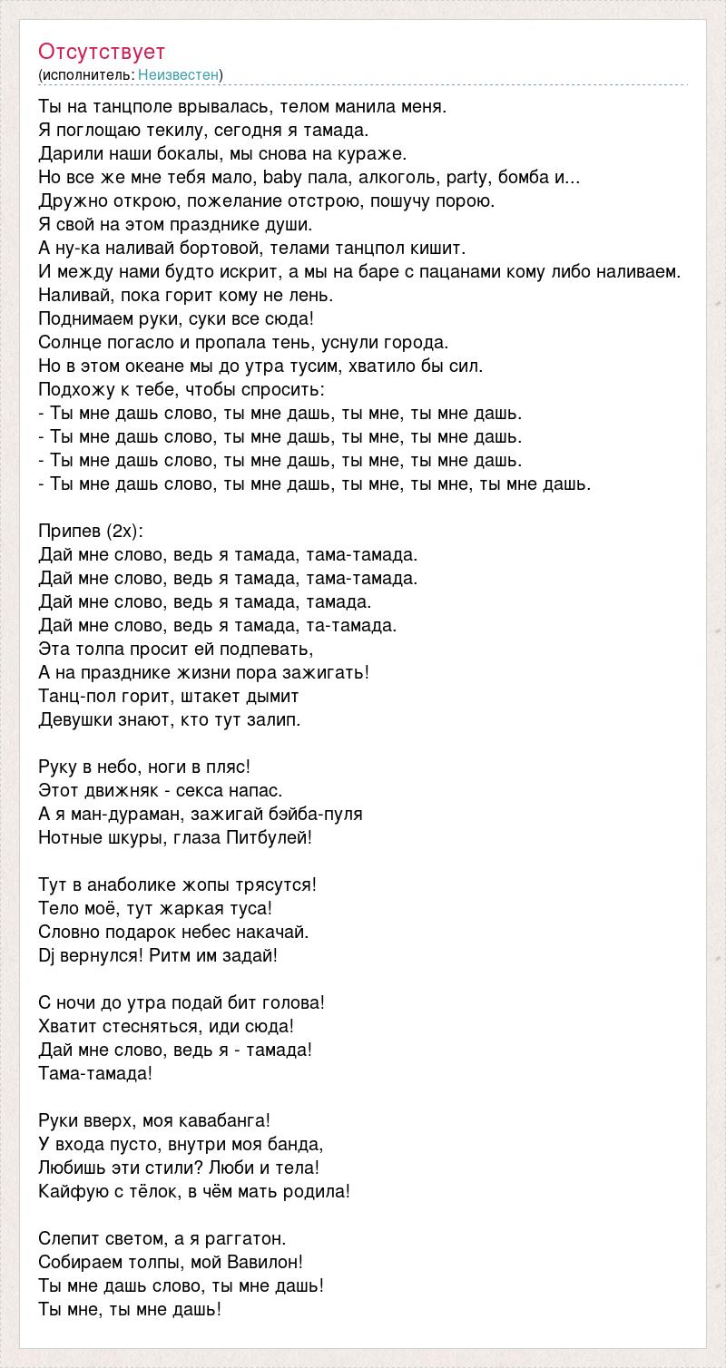 Ты на танцполе врывалась, телом манила меня. Я поглощаю текилу, сегодня я тамада. Дарили наши бокалы, мы снова на кураже. Но все же мне тебя мало, baby пала, алкоголь, party, бомба и... Дружно открою, пожелание отстрою, пошучу порою. Я свой на этом празднике души. А ну-ка наливай бортовой, телами танцпол кишит. И между нами будто искрит, а мы на баре с пацанами кому либо наливаем. Наливай, пока горит кому не лень. Поднимаем руки, суки все сюда! Солнце погасло и пропала тень, уснули города. Но в этом океане мы до утра тусим, хватило бы сил. Подхожу к тебе, чтобы спросить: - Ты мне дашь слово, ты мне дашь, ты мне, ты мне дашь. - Ты мне дашь слово, ты мне дашь, ты мне, ты мне дашь. - Ты мне дашь слово, ты мне дашь, ты мне, ты мне дашь. - Ты мне дашь слово, ты мне дашь, ты мне, ты мне, ты мне дашь. Припев (2x): Дай мне слово, ведь я тамада, тама-тамада. Дай мне слово, ведь я тамада, тама-тамада. Дай мне слово, ведь я тамада, тамада. Дай мне слово, ведь я тамада, та-тамада. Эта толпа просит ей подпевать, А на празднике жизни пора зажигать! Танц-пол горит, штакет дымит Девушки знают, кто тут залип. Руку в небо, ноги в пляс! Этот движняк - секса напас. А я ман-дураман, зажигай бэйба-пуля Нотные шкуры, глаза Питбулей! Тут в анаболике жопы трясутся! Тело моё, тут жаркая туса! Словно подарок небес накачай. Dj вернулся! Ритм им задай! С ночи до утра подай бит голова! Хватит стесняться, иди сюда! Дай мне слово, ведь я - тамада! Тама-тамада! Руки вверх, моя кавабанга! У входа пусто, внутри моя банда, Любишь эти стили? Люби и тела! Кайфую с тёлок, в чём мать родила! Слепит светом, а я раггатон. Собираем толпы, мой Вавилон! Ты мне дашь слово, ты мне дашь! Ты мне, ты мне дашь!