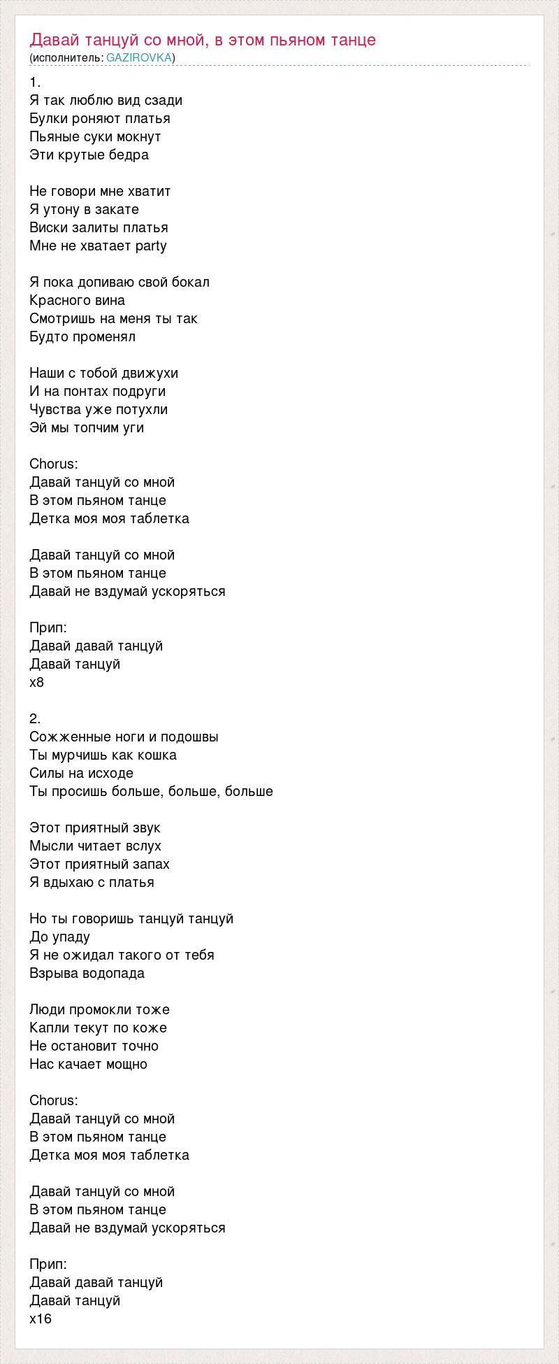 1. Я так люблю вид сзади Булки роняют платья Пьяные суки мокнут Эти крутые бедра Не говори мне хватит Я утону в закате Виски залиты платья Мне не хватает party Я пока допиваю свой бокал Красного вина Смотришь на меня ты так Будто променял Наши с тобой движухи И на понтах подруги Чувства уже потухли Эй мы топчим уги Chorus: Давай танцуй со мной В этом пьяном танце Детка моя моя таблетка Давай танцуй со мной В этом пьяном танце Давай не вздумай ускоряться Прип: Давай давай танцуй Давай танцуй х8 2. Сожженные ноги и подошвы Ты мурчишь как кошка Силы на исходе Ты просишь больше, больше, больше Этот приятный звук Мысли читает вслух Этот приятный запах Я вдыхаю с платья Но ты говоришь танцуй танцуй До упаду Я не ожидал такого от тебя Взрыва водопада Люди промокли тоже Капли текут по коже Не остановит точно Нас качает мощно Chorus: Давай танцуй со мной В этом пьяном танце Детка моя моя таблетка Давай танцуй со мной В этом пьяном танце Давай не вздумай ускоряться Прип: Давай давай танцуй Давай танцуй х16