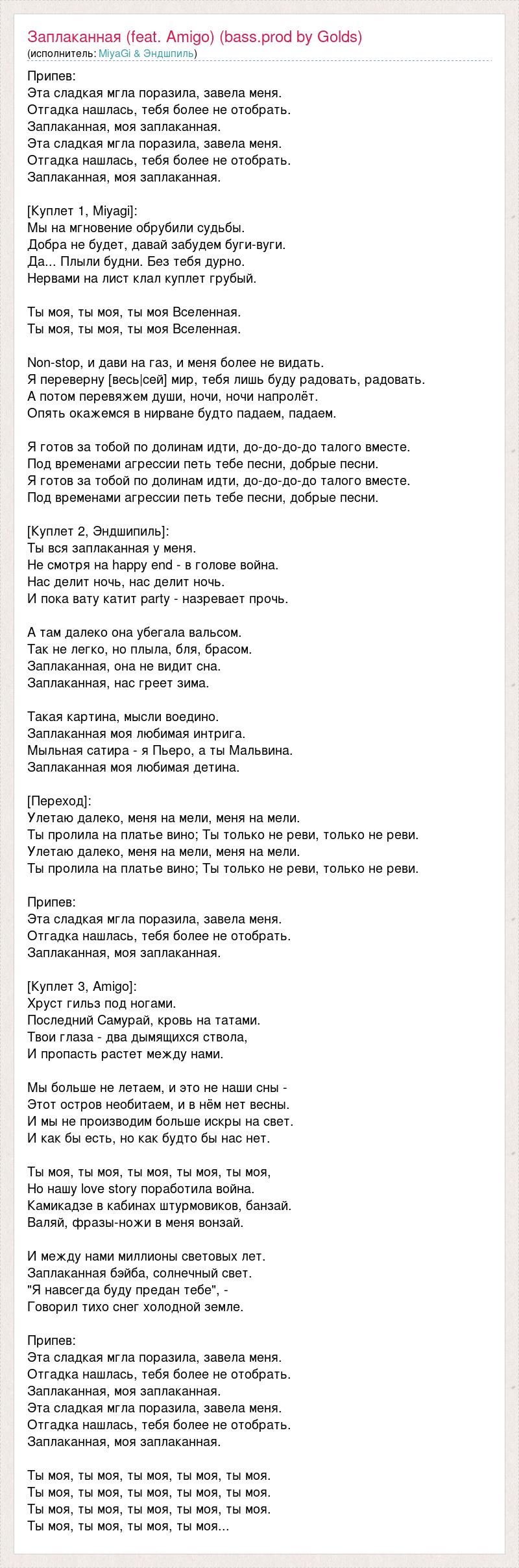 Припев: Эта сладкая мгла поразила, завела меня. Отгадка нашлась, тебя более не отобрать. Заплаканная, моя заплаканная. Эта сладкая мгла поразила, завела меня. Отгадка нашлась, тебя более не отобрать. Заплаканная, моя заплаканная. [Куплет 1, Miyagi]: Мы на мгновение обрубили судьбы. Добра не будет, давай забудем буги-вуги. Да... Плыли будни. Без тебя дурно. Нервами на лист клал куплет грубый. Ты моя, ты моя, ты моя Вселенная. Ты моя, ты моя, ты моя Вселенная. Non-stop, и дави на газ, и меня более не видать. Я переверну [весь|сей] мир, тебя лишь буду радовать, радовать. А потом перевяжем души, ночи, ночи напролёт. Опять окажемся в нирване будто падаем, падаем. Я готов за тобой по долинам идти, до-до-до-до талого вместе. Под временами агрессии петь тебе песни, добрые песни. Я готов за тобой по долинам идти, до-до-до-до талого вместе. Под временами агрессии петь тебе песни, добрые песни. [Куплет 2, Эндшипиль]: Ты вся заплаканная у меня. Не смотря на happy end - в голове война. Нас делит ночь, нас делит ночь. И пока вату катит party - назревает прочь. А там далеко она убегала вальсом. Так не легко, но плыла, бля, брасом. Заплаканная, она не видит сна. Заплаканная, нас греет зима. Такая картина, мысли воедино. Заплаканная моя любимая интрига. Мыльная сатира - я Пьеро, а ты Мальвина. Заплаканная моя любимая детина. [Переход]: Улетаю далеко, меня на мели, меня на мели. Ты пролила на платье вино; Ты только не реви, только не реви. Улетаю далеко, меня на мели, меня на мели. Ты пролила на платье вино; Ты только не реви, только не реви. Припев: Эта сладкая мгла поразила, завела меня. Отгадка нашлась, тебя более не отобрать. Заплаканная, моя заплаканная. [Куплет 3, Amigo]: Хруст гильз под ногами. Последний Самурай, кровь на татами. Твои глаза - два дымящихся ствола, И пропасть растет между нами. Мы больше не летаем, и это не наши сны - Этот остров необитаем, и в нём нет весны. И мы не производим больше искры на свет. И как бы есть, но как будто бы нас нет. Ты моя, ты моя, ты моя, ты моя, ты моя, Но нашу love story поработила война. Камикадзе в кабинах штурмовиков, банзай. Валяй, фразы-ножи в меня вонзай. И между нами миллионы световых лет. Заплаканная бэйба, солнечный свет. "Я навсегда буду предан тебе", - Говорил тихо снег холодной земле. Припев: Эта сладкая мгла поразила, завела меня. Отгадка нашлась, тебя более не отобрать. Заплаканная, моя заплаканная. Эта сладкая мгла поразила, завела меня. Отгадка нашлась, тебя более не отобрать. Заплаканная, моя заплаканная. Ты моя, ты моя, ты моя, ты моя, ты моя. Ты моя, ты моя, ты моя, ты моя, ты моя. Ты моя, ты моя, ты моя, ты моя, ты моя. Ты моя, ты моя, ты моя, ты моя...