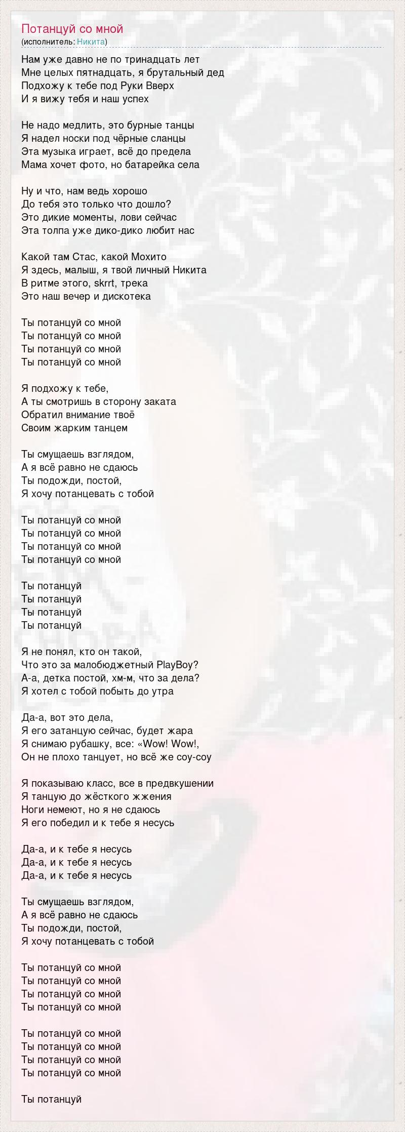 Нам уже давно не по тринадцать лет Мне целых пятнадцать, я брутальный дед Подхожу к тебе под Руки Вверх И я вижу тебя и наш успех Не надо медлить, это бурные танцы Я надел носки под чёрные сланцы Эта музыка играет, всё до предела Мама хочет фото, но батарейка села Ну и что, нам ведь хорошо До тебя это только что дошло? Это дикие моменты, лови сейчас Эта толпа уже дико-дико любит нас Какой там Стас, какой Мохито Я здесь, малыш, я твой личный Никита В ритме этого, skrrt, трека Это наш вечер и дискотека Ты потанцуй со мной Ты потанцуй со мной Ты потанцуй со мной Ты потанцуй со мной Я подхожу к тебе, А ты смотришь в сторону заката Обратил внимание твоё Своим жарким танцем Ты смущаешь взглядом, А я всё равно не сдаюсь Ты подожди, постой, Я хочу потанцевать с тобой Ты потанцуй со мной Ты потанцуй со мной Ты потанцуй со мной Ты потанцуй со мной Ты потанцуй Ты потанцуй Ты потанцуй Ты потанцуй Я не понял, кто он такой, Что это за малобюджетный PlayBoy? А-а, детка постой, хм-м, что за дела? Я хотел с тобой побыть до утра Да-а, вот это дела, Я его затанцую сейчас, будет жара Я снимаю рубашку, все: «Wow! Wow!, Он не плохо танцует, но всё же соу-соу Я показываю класс, все в предвкушении Я танцую до жёсткого жжения Ноги немеют, но я не сдаюсь Я его победил и к тебе я несусь Да-а, и к тебе я несусь Да-а, и к тебе я несусь Да-а, и к тебе я несусь Ты смущаешь взглядом, А я всё равно не сдаюсь Ты подожди, постой, Я хочу потанцевать с тобой Ты потанцуй со мной Ты потанцуй со мной Ты потанцуй со мной Ты потанцуй со мной Ты потанцуй со мной Ты потанцуй со мной Ты потанцуй со мной Ты потанцуй со мной Ты потанцуй