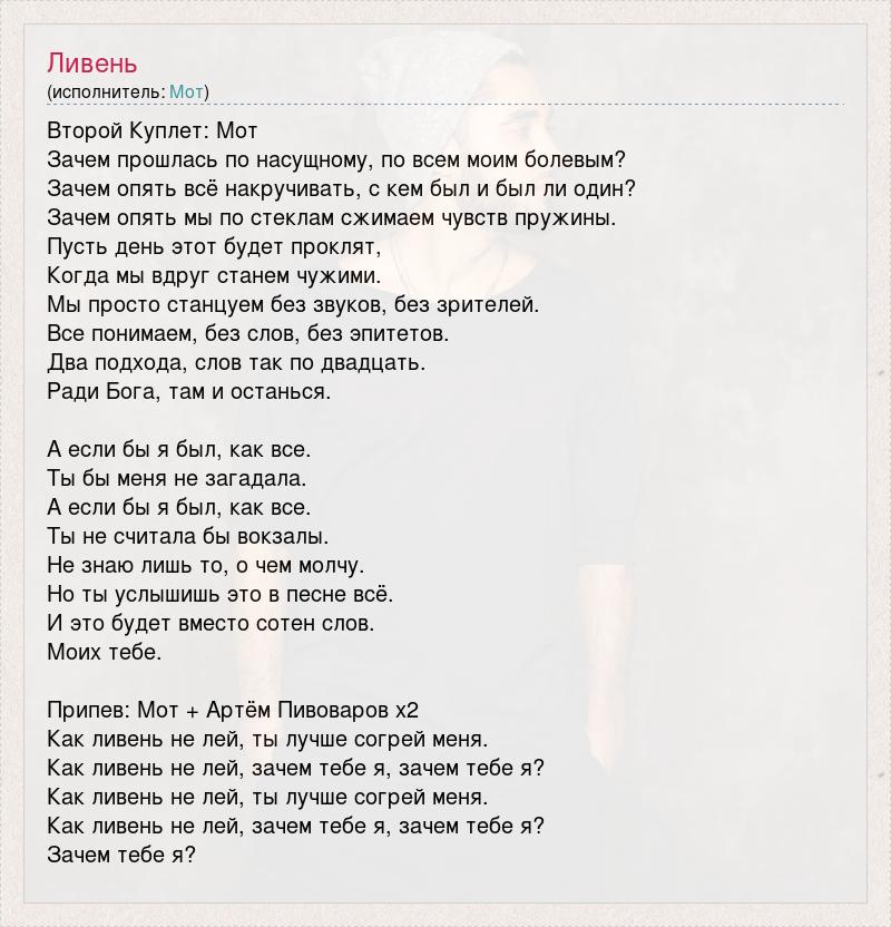 Второй Куплет: Мот Зачем прошлась по насущному, по всем моим болевым? Зачем опять всё накручивать, с кем был и был ли один? Зачем опять мы по стеклам сжимаем чувств пружины. Пусть день этот будет проклят, Когда мы вдруг станем чужими. Мы просто станцуем без звуков, без зрителей. Все понимаем, без слов, без эпитетов. Два подхода, слов так по двадцать. Ради Бога, там и останься. А если бы я был, как все. Ты бы меня не загадала. А если бы я был, как все. Ты не считала бы вокзалы. Не знаю лишь то, о чем молчу. Но ты услышишь это в песне всё. И это будет вместо сотен слов. Моих тебе. Припев: Мот + Артём Пивоваров х2 Как ливень не лей, ты лучше согрей меня. Как ливень не лей, зачем тебе я, зачем тебе я? Как ливень не лей, ты лучше согрей меня. Как ливень не лей, зачем тебе я, зачем тебе я? Зачем тебе я?