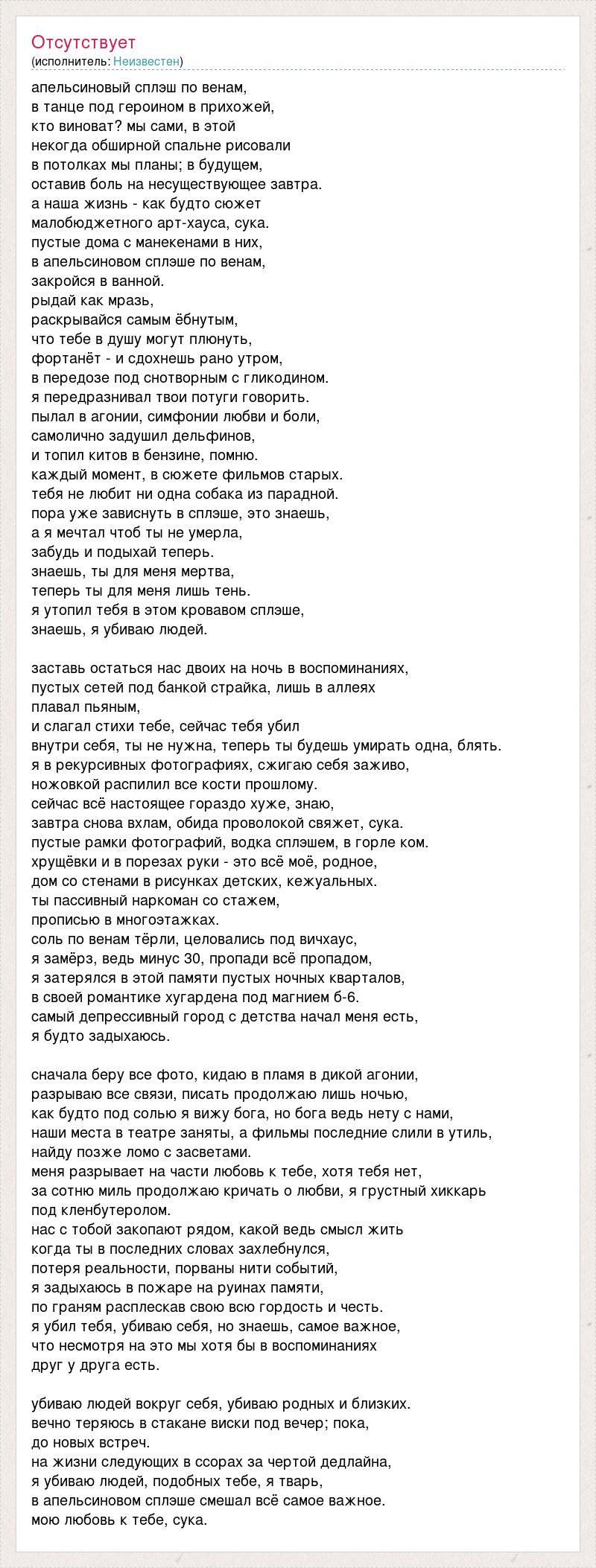апельсиновый сплэш по венам, в танце под героином в прихожей, кто виноват? мы сами, в этой некогда обширной спальне рисовали в потолках мы планы; в будущем, оставив боль на несуществующее завтра. а наша жизнь - как будто сюжет малобюджетного арт-хауса, сука. пустые дома с манекенами в них, в апельсиновом сплэше по венам, закройся в ванной. рыдай как мразь, раскрывайся самым ёбнутым, что тебе в душу могут плюнуть, фортанёт - и сдохнешь рано утром, в передозе под снотворным с гликодином. я передразнивал твои потуги говорить. пылал в агонии, симфонии любви и боли, самолично задушил дельфинов, и топил китов в бензине, помню. каждый момент, в сюжете фильмов старых. тебя не любит ни одна собака из парадной. пора уже зависнуть в сплэше, это знаешь, а я мечтал чтоб ты не умерла, забудь и подыхай теперь. знаешь, ты для меня мертва, теперь ты для меня лишь тень. я утопил тебя в этом кровавом сплэше, знаешь, я убиваю людей. заставь остаться нас двоих на ночь в воспоминаниях, пустых сетей под банкой страйка, лишь в аллеях плавал пьяным, и слагал стихи тебе, сейчас тебя убил внутри себя, ты не нужна, теперь ты будешь умирать одна, блять. я в рекурсивных фотографиях, сжигаю себя заживо, ножовкой распилил все кости прошлому. сейчас всё настоящее гораздо хуже, знаю, завтра снова вхлам, обида проволокой свяжет, сука. пустые рамки фотографий, водка сплэшем, в горле ком. хрущёвки и в порезах руки - это всё моё, родное, дом со стенами в рисунках детских, кежуальных. ты пассивный наркоман со стажем, прописью в многоэтажках. соль по венам тёрли, целовались под вичхаус, я замёрз, ведь минус 30, пропади всё пропадом, я затерялся в этой памяти пустых ночных кварталов, в своей романтике хугардена под магнием б-6. самый депрессивный город с детства начал меня есть, я будто задыхаюсь. сначала беру все фото, кидаю в пламя в дикой агонии, разрываю все связи, писать продолжаю лишь ночью, как будто под солью я вижу бога, но бога ведь нету с нами, наши места в театре заняты, а фильмы последние слили в утиль, найду позже ломо с засветами. меня разрывает на части любовь к тебе, хотя тебя нет, за сотню миль продолжаю кричать о любви, я грустный хиккарь под кленбутеролом. нас с тобой закопают рядом, какой ведь смысл жить когда ты в последних словах захлебнулся, потеря реальности, порваны нити событий, я задыхаюсь в пожаре на руинах памяти, по граням расплескав свою всю гордость и честь. я убил тебя, убиваю себя, но знаешь, самое важное, что несмотря на это мы хотя бы в воспоминаниях друг у друга есть. убиваю людей вокруг себя, убиваю родных и близких. вечно теряюсь в стакане виски под вечер; пока, до новых встреч. на жизни следующих в ссорах за чертой дедлайна, я убиваю людей, подобных тебе, я тварь, в апельсиновом сплэше смешал всё самое важное. мою любовь к тебе, сука.