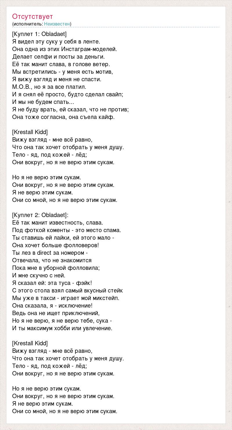 [Куплет 1: Obladaet] Я видел эту суку у себя в ленте. Она одна из этих Инстаграм-моделей. Делает селфи и посты за деньги. Её так манит слава, в голове ветер. Мы встретились - у меня есть мотив, Я вижу взгляд и меня не спасти. M.O.B., но я за все платил. И я снял её просто, будто сделал свайп; И мы не будем спать... Я не буду врать, ей сказал, что не против; Она тоже согласна, она съела кайф. [Krestall Kidd] Вижу взгляд - мне всё равно, Что она так хочет отобрать у меня душу. Тело - яд, под кожей - лёд; Они вокруг, но я не верю этим сукам. Но я не верю этим сукам. Они вокруг, но я не верю этим сукам. Я не верю этим сукам. Они со мной, но я не верю этим сукам. [Куплет 2: Obladaet]: Её так манит известность, слава. Под фоткой коменты - это место спама. Ты ставишь ей лайки, ей этого мало - Она хочет больше фолловеров! Ты лез в direct за номером - Отвечала, что не знакомится Пока мне в уборной фолловила; И мне скучно с ней. Я сказал ей: эта туса - фэйк! С этого стола взял самый вкусный стейк Мы уже в такси - играет мой микстейп. Она сказала, я - исключение! Ведь она не ищет приключений, Но я не верю, я не верю тебе, сука - И ты максимум хобби или увлечение. [Krestall Kidd] Вижу взгляд - мне всё равно, Что она так хочет отобрать у меня душу. Тело - яд, под кожей - лёд; Они вокруг, но я не верю этим сукам. Но я не верю этим сукам. Они вокруг, но я не верю этим сукам. Я не верю этим сукам. Они со мной, но я не верю этим сукам.