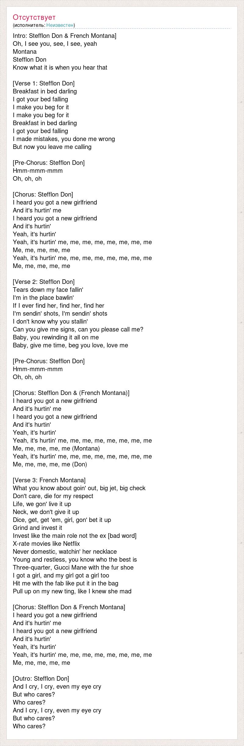 Intro: Stefflon Don & French Montana] Oh, I see you, see, I see, yeah Montana Stefflon Don Know what it is when you hear that [Verse 1: Stefflon Don] Breakfast in bed darling I got your bed falling I make you beg for it I make you beg for it Breakfast in bed darling I got your bed falling I made mistakes, you done me wrong But now you leave me calling [Pre-Chorus: Stefflon Don] Hmm-mmm-mmm Oh, oh, oh [Chorus: Stefflon Don] I heard you got a new girlfriend And it's hurtin' me I heard you got a new girlfriend And it's hurtin' Yeah, it's hurtin' Yeah, it's hurtin' me, me, me, me, me, me, me, me Me, me, me, me, me Yeah, it's hurtin' me, me, me, me, me, me, me, me Me, me, me, me, me [Verse 2: Stefflon Don] Tears down my face fallin' I'm in the place bawlin' If I ever find her, find her, find her I'm sendin' shots, I'm sendin' shots I don't know why you stallin' Can you give me signs, can you please call me? Baby, you rewinding it all on me Baby, give me time, beg you love, love me [Pre-Chorus: Stefflon Don] Hmm-mmm-mmm Oh, oh, oh [Chorus: Stefflon Don & (French Montana)] I heard you got a new girlfriend And it's hurtin' me I heard you got a new girlfriend And it's hurtin' Yeah, it's hurtin' Yeah, it's hurtin' me, me, me, me, me, me, me, me Me, me, me, me, me (Montana) Yeah, it's hurtin' me, me, me, me, me, me, me, me Me, me, me, me, me (Don) [Verse 3: French Montana] What you know about goin' out, big jet, big check Don't care, die for my respect Life, we gon' live it up Neck, we don't give it up Dice, get, get 'em, girl, gon' bet it up Grind and invest it Invest like the main role not the ex [bad word] X-rate movies like Netflix Never domestic, watchin' her necklace Young and restless, you know who the best is Three-quarter, Gucci Mane with the fur shoe I got a girl, and my girl got a girl too Hit me with the fab like put it in the bag Pull up on my new ting, like I knew she mad [Chorus: Stefflon Don & French Montana] I heard you got a new girlfriend And it's hurtin' me I heard you got a new girlfriend And it's hurtin' Yeah, it's hurtin' Yeah, it's hurtin' me, me, me, me, me, me, me, me Me, me, me, me, me [Outro: Stefflon Don] And I cry, I cry, even my eye cry But who cares? Who cares? And I cry, I cry, even my eye cry But who cares? Who cares?