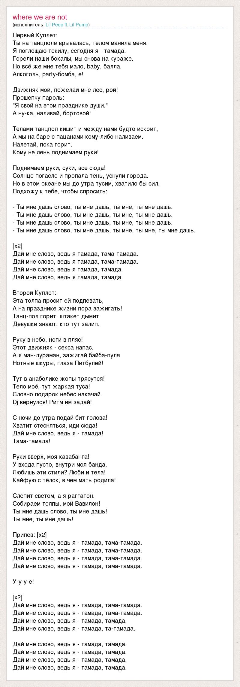 Первый Куплет: Ты на танцполе врывалась, телом манила меня. Я поглощаю текилу, сегодня я - тамада. Горели наши бокалы, мы снова на кураже. Но всё же мне тебя мало, baby, балла, Алкоголь, party-бомба, е! Движняк мой, пожелай мне лес, рой! Прошепчу пароль: "Я свой на этом празднике души." А ну-ка, наливай, бортовой! Телами танцпол кишит и между нами будто искрит, А мы на баре с пацанами кому-либо наливаем. Налетай, пока горит. Кому не лень поднимаем руки! Поднимаем руки, суки, все сюда! Солнце погасло и пропала тень, уснули города. Но в этом океане мы до утра тусим, хватило бы сил. Подхожу к тебе, чтобы спросить: - Ты мне дашь слово, ты мне дашь, ты мне, ты мне дашь. - Ты мне дашь слово, ты мне дашь, ты мне, ты мне дашь. - Ты мне дашь слово, ты мне дашь, ты мне, ты мне дашь. - Ты мне дашь слово, ты мне дашь, ты мне, ты мне, ты мне дашь. [х2] Дай мне слово, ведь я тамада, тама-тамада. Дай мне слово, ведь я тамада, тама-тамада. Дай мне слово, ведь я тамада, тамада. Дай мне слово, ведь я тамада, тамада. Второй Куплет: Эта толпа просит ей подпевать, А на празднике жизни пора зажигать! Танц-пол горит, штакет дымит Девушки знают, кто тут залип. Руку в небо, ноги в пляс! Этот движняк - секса напас. А я ман-дураман, зажигай бэйба-пуля Нотные шкуры, глаза Питбулей! Тут в анаболике жопы трясутся! Тело моё, тут жаркая туса! Словно подарок небес накачай. Dj вернулся! Ритм им задай! С ночи до утра подай бит голова! Хватит стесняться, иди сюда! Дай мне слово, ведь я - тамада! Тама-тамада! Руки вверх, моя кавабанга! У входа пусто, внутри моя банда, Любишь эти стили? Люби и тела! Кайфую с тёлок, в чём мать родила! Слепит светом, а я раггатон. Собираем толпы, мой Вавилон! Ты мне дашь слово, ты мне дашь! Ты мне, ты мне дашь! Припев: [х2] Дай мне слово, ведь я - тамада, тама-тамада. Дай мне слово, ведь я - тамада, тама-тамада. Дай мне слово, ведь я - тамада, тама-тамада. Дай мне слово, ведь я - тамада, тама-тамада. У-у-у-е! [х2] Дай мне слово, ведь я - тамада, тама-тамада. Дай мне слово, ведь я - тамада, тама-тамада. Дай мне слово, ведь я - тамада, тамада. Дай мне слово, ведь я - тамада, та-тамада. Дай мне слово, ведь я - тамада, тамада. Дай мне слово, ведь я - тамада, тамада. Дай мне слово, ведь я - тамада, тамада. Дай мне слово, ведь я - тамада, тамада.