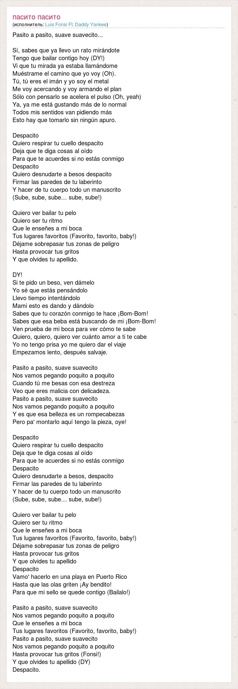 Pasito a pasito, suave suavecito... Sí, sabes que ya llevo un rato mirándote Tengo que bailar contigo hoy (DY!) Vi que tu mirada ya estaba llamándome Muéstrame el camino que yo voy (Oh). Tú, tú eres el imán y yo soy el metal Me voy acercando y voy armando el plan Sólo con pensarlo se acelera el pulso (Oh, yeah) Ya, ya me está gustando más de lo normal Todos mis sentidos van pidiendo más Esto hay que tomarlo sin ningún apuro. Despacito Quiero respirar tu cuello despacito Deja que te diga cosas al oído Para que te acuerdes si no estás conmigo Despacito Quiero desnudarte a besos despacito Firmar las paredes de tu laberinto Y hacer de tu cuerpo todo un manuscrito (Sube, sube, sube… sube, sube!) Quiero ver bailar tu pelo Quiero ser tu ritmo Que le enseñes a mi boca Tus lugares favoritos (Favorito, favorito, baby!) Déjame sobrepasar tus zonas de peligro Hasta provocar tus gritos Y que olvides tu apellido. DY! Si te pido un beso, ven dámelo Yo sé que estás pensándolo Llevo tiempo intentándolo Mami esto es dando y dándolo Sabes que tu corazón conmigo te hace ¡Bom-Bom! Sabes que esa beba está buscando de mi ¡Bom-Bom! Ven prueba de mi boca para ver cómo te sabe Quiero, quiero, quiero ver cuánto amor a ti te cabe Yo no tengo prisa yo me quiero dar el viaje Empezamos lento, después salvaje. Pasito a pasito, suave suavecito Nos vamos pegando poquito a poquito Cuando tú me besas con esa destreza Veo que eres malicia con delicadeza. Pasito a pasito, suave suavecito Nos vamos pegando poquito a poquito Y es que esa belleza es un rompecabezas Pero pa' montarlo aquí tengo la pieza, oye! Despacito Quiero respirar tu cuello despacito Deja que te diga cosas al oído Para que te acuerdes si no estás conmigo Despacito Quiero desnudarte a besos, despacito Firmar las paredes de tu laberinto Y hacer de tu cuerpo todo un manuscrito (Sube, sube, sube… sube, sube!) Quiero ver bailar tu pelo Quiero ser tu ritmo Que le enseñes a mi boca Tus lugares favoritos (Favorito, favorito, baby!) Déjame sobrepasar tus zonas de peligro Hasta provocar tus gritos Y que olvides tu apellido Despacito Vamo' hacerlo en una playa en Puerto Rico Hasta que las olas griten ¡Ay bendito! Para que mi sello se quede contigo (Bailalo!) Pasito a pasito, suave suavecito Nos vamos pegando poquito a poquito Que le enseñes a mi boca Tus lugares favoritos (Favorito, favorito, baby!) Pasito a pasito, suave suavecito Nos vamos pegando poquito a poquito Hasta provocar tus gritos (Fonsi!) Y que olvides tu apellido (DY) Despacito.