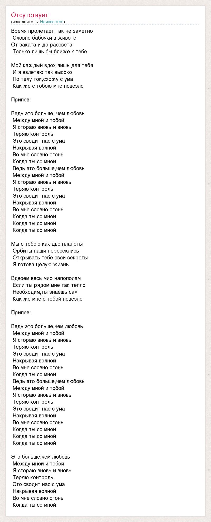 Время пролетает так не заметно Словно бабочки в животе От заката и до рассвета Только лишь бы ближе к тебе Мой каждый вдох лишь для тебя И я взлетаю так высоко По телу ток,схожу с ума Как же с тобою мне повезло Припев: Ведь это больше, чем любовь Между мной и тобой Я сгораю вновь и вновь Теряю контроль Это сводит нас с ума Накрывая волной Во мне словно огонь Когда ты со мной Ведь это больше,чем любовь Между мной и тобой Я сгораю вновь и вновь Теряю контроль Это сводит нас с ума Накрывая волной Во мне словно огонь Когда ты со мной Когда ты со мной Когда ты со мной Мы с тобою как две планеты Орбиты наши пересеклись Открывать тебе свои секреты Я готова целую жизнь Вдвоем весь мир напополам Если ты рядом мне так тепло Необходим,ты знаешь сам Как же мне с тобой повезло Припев: Ведь это больше,чем любовь Между мной и тобой Я сгораю вновь и вновь Теряю контроль Это сводит нас с ума Накрывая волной Во мне словно огонь Когда ты со мной Ведь это больше,чем любовь Между мной и тобой Я сгораю вновь и вновь Теряю контроль Это сводит нас с ума Накрывая волной Во мне словно огонь Когда ты со мной Когда ты со мной Когда ты со мной Это больше,чем любовь Между мной и тобой Я сгораю вновь и вновь Теряю контроль Это сводит нас с ума Накрывая волной Во мне словно огонь Когда ты со мной