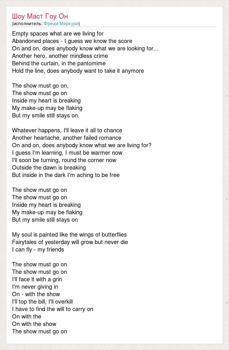 Empty spaces what are we living for Abandoned places - I guess we know the score On and on, does anybody know what we are looking for... Another hero, another mindless crime Behind the curtain, in the pantomime Hold the line, does anybody want to take it anymore The show must go on, The show must go on Inside my heart is breaking My make-up may be flaking But my smile still stays on. Whatever happens, I'll leave it all to chance Another heartache, another failed romance On and on, does anybody know what we are living for? I guess I'm learning, I must be warmer now I'll soon be turning, round the corner now Outside the dawn is breaking But inside in the dark I'm aching to be free The show must go on The show must go on Inside my heart is breaking My make-up may be flaking But my smile still stays on My soul is painted like the wings of butterflies Fairytales of yesterday will grow but never die I can fly - my friends The show must go on The show must go on I'll face it with a grin I'm never giving in On - with the show I'll top the bill, I'll overkill I have to find the will to carry on On with the On with the show The show must go on