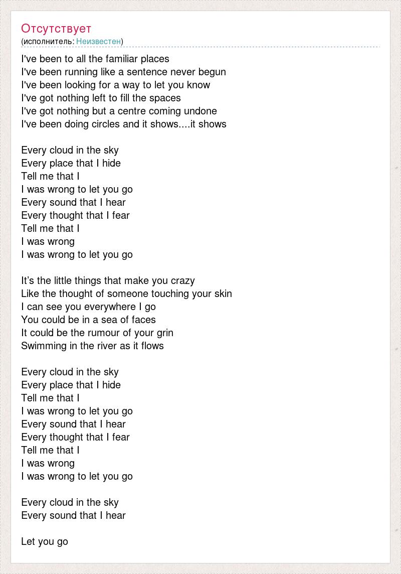 I've been to all the familiar places I've been running like a sentence never begun I've been looking for a way to let you know I've got nothing left to fill the spaces I've got nothing but a centre coming undone I've been doing circles and it shows....it shows Every cloud in the sky Every place that I hide Tell me that I I was wrong to let you go Every sound that I hear Every thought that I fear Tell me that I I was wrong I was wrong to let you go It’s the little things that make you crazy Like the thought of someone touching your skin I can see you everywhere I go You could be in a sea of faces It could be the rumour of your grin Swimming in the river as it flows Every cloud in the sky Every place that I hide Tell me that I I was wrong to let you go Every sound that I hear Every thought that I fear Tell me that I I was wrong I was wrong to let you go Every cloud in the sky Every sound that I hear Let you go