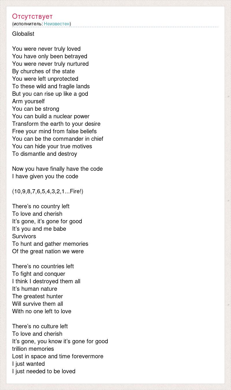 Globalist You were never truly loved You have only been betrayed You were never truly nurtured By churches of the state You were left unprotected To these wild and fragile lands But you can rise up like a god Arm yourself You can be strong You can build a nuclear power Transform the earth to your desire Free your mind from false beliefs You can be the commander in chief You can hide your true motives To dismantle and destroy Now you have finally have the code I have given you the code (10,9,8,7,6,5,4,3,2,1...Fire!) There’s no country left To love and cherish It’s gone, it’s gone for good It’s you and me babe Survivors To hunt and gather memories Of the great nation we were There’s no countries left To fight and conquer I think I destroyed them all It’s human nature The greatest hunter Will survive them all With no one left to love There’s no culture left To love and cherish It’s gone, you know it’s gone for good trillion memories Lost in space and time forevermore I just wanted I just needed to be loved