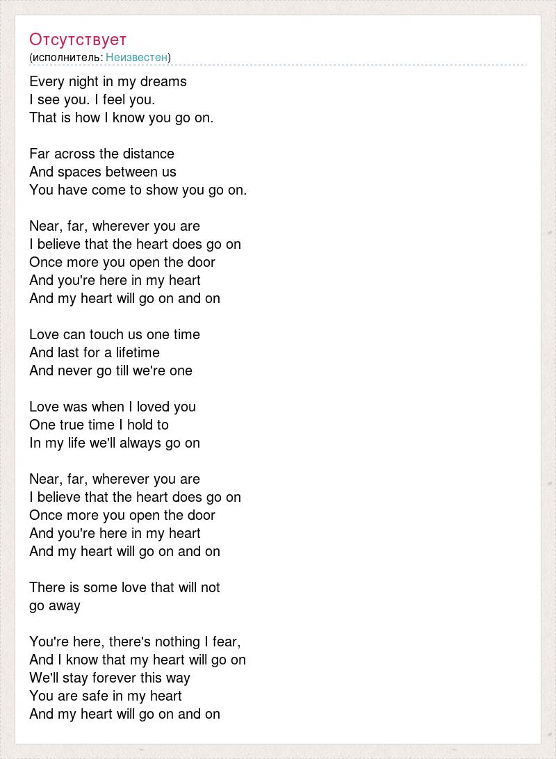 Every night in my dreams I see you. I feel you. That is how I know you go on. Far across the distance And spaces between us You have come to show you go on. Near, far, wherever you are I believe that the heart does go on Once more you open the door And you're here in my heart And my heart will go on and on Love can touch us one time And last for a lifetime And never go till we're one Love was when I loved you One true time I hold to In my life we'll always go on Near, far, wherever you are I believe that the heart does go on Once more you open the door And you're here in my heart And my heart will go on and on There is some love that will not go away You're here, there's nothing I fear, And I know that my heart will go on We'll stay forever this way You are safe in my heart And my heart will go on and on