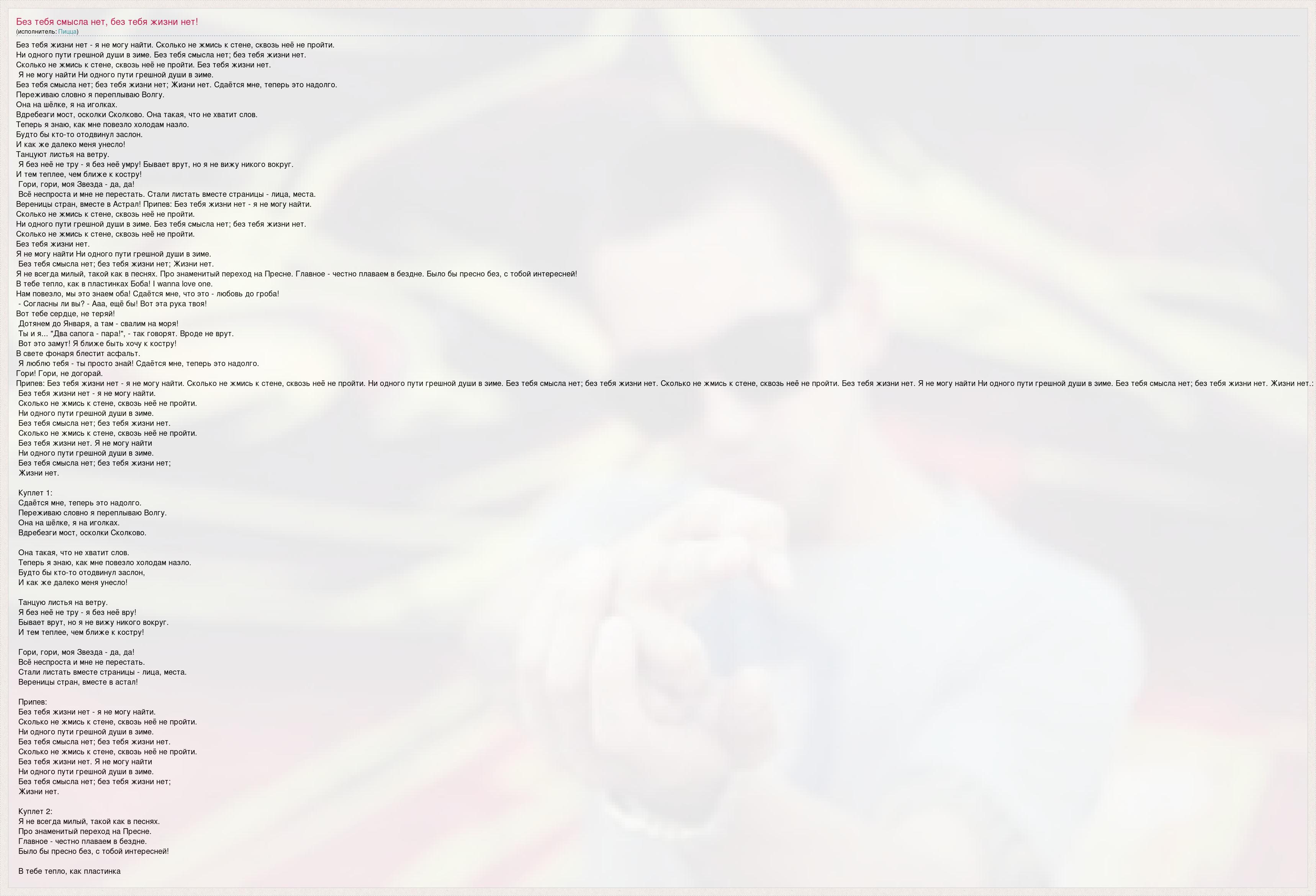 Куплет 1: Сдаётся мне, теперь это надолго. Переживаю словно я переплываю Волгу. Она на шёлке, я на иголках. Вдребезги мост, осколки Сколково. Она такая, что не хватит слов. Теперь я знаю, как мне повезло холодам назло. Будто бы кто-то отодвинул заслон, И как же далеко меня унесло! Танцую листья на ветру. Я без неё не тру - я без неё вру! Бывает врут, но я не вижу никого вокруг. И тем теплее, чем ближе к костру! Гори, гори, моя Звезда - да, да! Всё неспроста и мне не перестать. Стали листать вместе страницы - лица, места. Вереницы стран, вместе в астал! Припев: Без тебя жизни нет - я не могу найти. Сколько не жмись к стене, сквозь неё не пройти. Ни одного пути грешной души в зиме. Без тебя смысла нет; без тебя жизни нет. Сколько не жмись к стене, сквозь неё не пройти. Без тебя жизни нет. Я не могу найти Ни одного пути грешной души в зиме. Без тебя смысла нет; без тебя жизни нет; Жизни нет. Куплет 2: Я не всегда милый, такой как в песнях. Про знаменитый переход на Пресне. Главное - честно плаваем в бездне. Было бы пресно без, с тобой интересней! В тебе тепло, как в пластинках Боба! I wanna love one. Нам повезло, мы это знаем оба! Сдаётся мне, что это - любовь до гроба! - Согласны ли вы? - Ааа, ещё бы! Вот эта рука твоя! Вот тебе сердце, не теряй! Дотянем до Января, а там - свалим на моря! Ты и я... "Два сапога - пара!", - так говорят. Вроде не врут. Вот это замут! Я ближе быть хочу к костру! В свете фонаря блестит асфальт. Я люблю тебя - ты просто знай! Сдаётся мне, теперь это надолго. Гори! Гори, не догорай. Припев: Без тебя жизни нет - я не могу найти. Сколько не жмись к стене, сквозь неё не пройти. Ни одного пути грешной души в зиме. Без тебя смысла нет; без тебя жизни нет. Сколько не жмись к стене, сквозь неё не пройти. Без тебя жизни нет. Я не могу найти Ни одного пути грешной души в зиме. Без тебя смысла нет; без тебя жизни нет; Жизни нет.