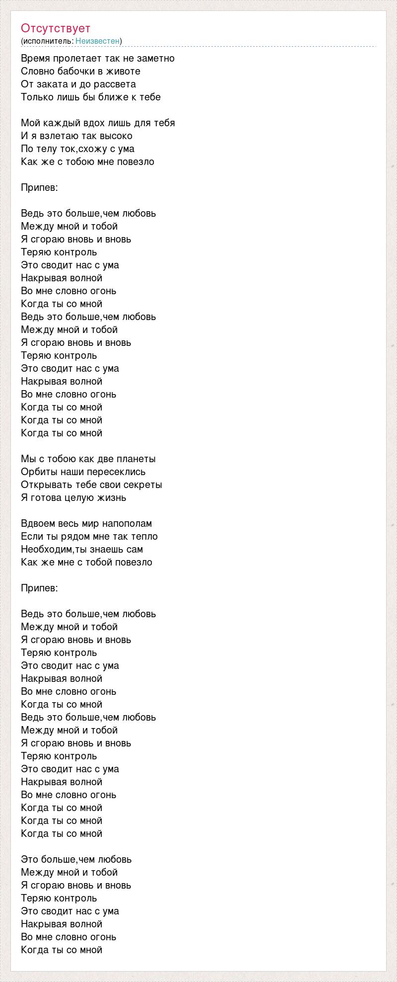 Время пролетает так не заметно Словно бабочки в животе От заката и до рассвета Только лишь бы ближе к тебе Мой каждый вдох лишь для тебя И я взлетаю так высоко По телу ток,схожу с ума Как же с тобою мне повезло Припев: Ведь это больше,чем любовь Между мной и тобой Я сгораю вновь и вновь Теряю контроль Это сводит нас с ума Накрывая волной Во мне словно огонь Когда ты со мной Ведь это больше,чем любовь Между мной и тобой Я сгораю вновь и вновь Теряю контроль Это сводит нас с ума Накрывая волной Во мне словно огонь Когда ты со мной Когда ты со мной Когда ты со мной Мы с тобою как две планеты Орбиты наши пересеклись Открывать тебе свои секреты Я готова целую жизнь Вдвоем весь мир напополам Если ты рядом мне так тепло Необходим,ты знаешь сам Как же мне с тобой повезло Припев: Ведь это больше,чем любовь Между мной и тобой Я сгораю вновь и вновь Теряю контроль Это сводит нас с ума Накрывая волной Во мне словно огонь Когда ты со мной Ведь это больше,чем любовь Между мной и тобой Я сгораю вновь и вновь Теряю контроль Это сводит нас с ума Накрывая волной Во мне словно огонь Когда ты со мной Когда ты со мной Когда ты со мной Это больше,чем любовь Между мной и тобой Я сгораю вновь и вновь Теряю контроль Это сводит нас с ума Накрывая волной Во мне словно огонь Когда ты со мной