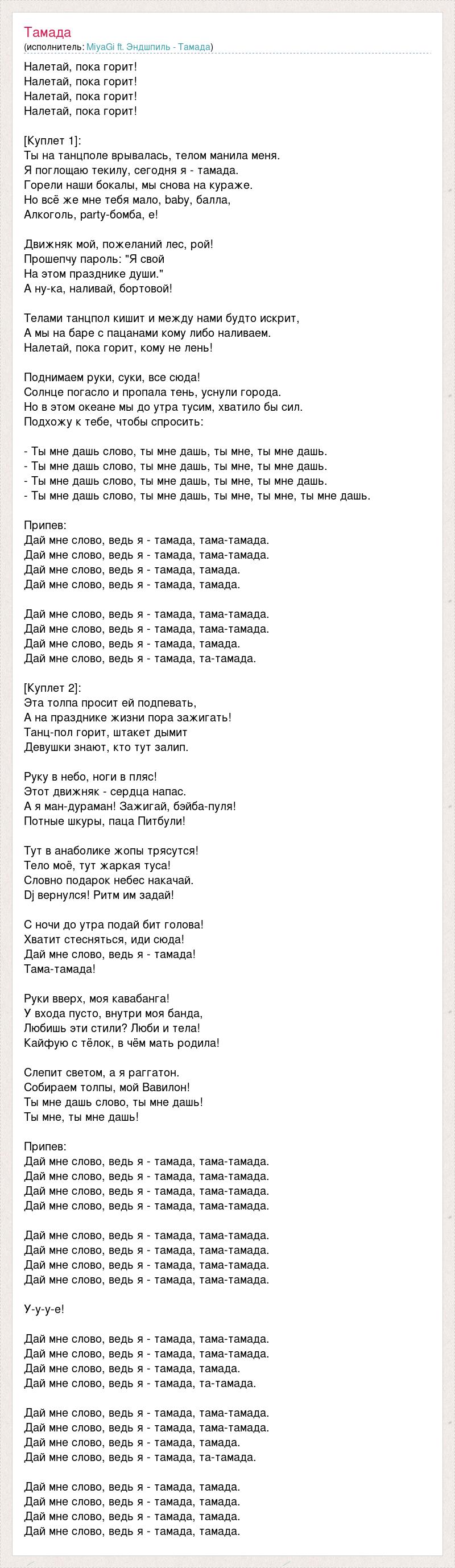 Налетай, пока горит! Налетай, пока горит! Налетай, пока горит! Налетай, пока горит! [Куплет 1]: Ты на танцполе врывалась, телом манила меня. Я поглощаю текилу, сегодня я - тамада. Горели наши бокалы, мы снова на кураже. Но всё же мне тебя мало, baby, балла, Алкоголь, party-бомба, е! Движняк мой, пожеланий лес, рой! Прошепчу пароль: "Я свой На этом празднике души." А ну-ка, наливай, бортовой! Телами танцпол кишит и между нами будто искрит, А мы на баре с пацанами кому либо наливаем. Налетай, пока горит, кому не лень! Поднимаем руки, суки, все сюда! Солнце погасло и пропала тень, уснули города. Но в этом океане мы до утра тусим, хватило бы сил. Подхожу к тебе, чтобы спросить: - Ты мне дашь слово, ты мне дашь, ты мне, ты мне дашь. - Ты мне дашь слово, ты мне дашь, ты мне, ты мне дашь. - Ты мне дашь слово, ты мне дашь, ты мне, ты мне дашь. - Ты мне дашь слово, ты мне дашь, ты мне, ты мне, ты мне дашь. Припев: Дай мне слово, ведь я - тамада, тама-тамада. Дай мне слово, ведь я - тамада, тама-тамада. Дай мне слово, ведь я - тамада, тамада. Дай мне слово, ведь я - тамада, тамада. Дай мне слово, ведь я - тамада, тама-тамада. Дай мне слово, ведь я - тамада, тама-тамада. Дай мне слово, ведь я - тамада, тамада. Дай мне слово, ведь я - тамада, та-тамада. [Куплет 2]: Эта толпа просит ей подпевать, А на празднике жизни пора зажигать! Танц-пол горит, штакет дымит Девушки знают, кто тут залип. Руку в небо, ноги в пляс! Этот движняк - сердца напас. А я ман-дураман! Зажигай, бэйба-пуля! Потные шкуры, паца Питбули! Тут в анаболике жопы трясутся! Тело моё, тут жаркая туса! Словно подарок небес накачай. Dj вернулся! Ритм им задай! С ночи до утра подай бит голова! Хватит стесняться, иди сюда! Дай мне слово, ведь я - тамада! Тама-тамада! Руки вверх, моя кавабанга! У входа пусто, внутри моя банда, Любишь эти стили? Люби и тела! Кайфую с тёлок, в чём мать родила! Слепит светом, а я раггатон. Собираем толпы, мой Вавилон! Ты мне дашь слово, ты мне дашь! Ты мне, ты мне дашь! Припев: Дай мне слово, ведь я - тамада, тама-тамада. Дай мне слово, ведь я - тамада, тама-тамада. Дай мне слово, ведь я - тамада, тама-тамада. Дай мне слово, ведь я - тамада, тама-тамада. Дай мне слово, ведь я - тамада, тама-тамада. Дай мне слово, ведь я - тамада, тама-тамада. Дай мне слово, ведь я - тамада, тама-тамада. Дай мне слово, ведь я - тамада, тама-тамада. У-у-у-е! Дай мне слово, ведь я - тамада, тама-тамада. Дай мне слово, ведь я - тамада, тама-тамада. Дай мне слово, ведь я - тамада, тамада. Дай мне слово, ведь я - тамада, та-тамада. Дай мне слово, ведь я - тамада, тама-тамада. Дай мне слово, ведь я - тамада, тама-тамада. Дай мне слово, ведь я - тамада, тамада. Дай мне слово, ведь я - тамада, та-тамада. Дай мне слово, ведь я - тамада, тамада. Дай мне слово, ведь я - тамада, тамада. Дай мне слово, ведь я - тамада, тамада. Дай мне слово, ведь я - тамада, тамада.