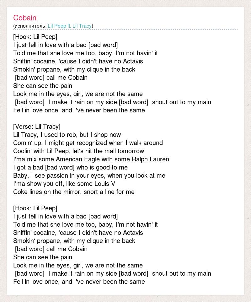 [Hook: Lil Peep] I just fell in love with a bad [bad word] Told me that she love me too, baby, I'm not havin' it Sniffin' cocaine, 'cause I didn't have no Actavis Smokin' propane, with my clique in the back [bad word] call me Cobain She can see the pain Look me in the eyes, girl, we are not the same [bad word] I make it rain on my side [bad word] shout out to my main Fell in love once, and I've never been the same [Verse: Lil Tracy] Lil Tracy, I used to rob, but I shop now Comin' up, I might get recognized when I walk around Coolin' with Lil Peep, let's hit the mall tomorrow I'ma mix some American Eagle with some Ralph Lauren I got a bad [bad word] who is good to me Baby, I see passion in your eyes, when you look at me I'ma show you off, like some Louis V Coke lines on the mirror, snort a line for me [Hook: Lil Peep] I just fell in love with a bad [bad word] Told me that she love me too, baby, I'm not havin' it Sniffin' cocaine, 'cause I didn't have no Actavis Smokin' propane, with my clique in the back [bad word] call me Cobain She can see the pain Look me in the eyes, girl, we are not the same [bad word] I make it rain on my side [bad word] shout out to my main Fell in love once, and I've never been the same
