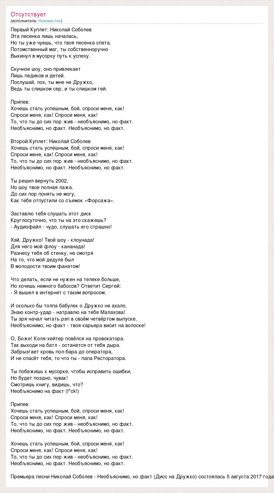Первый Куплет: Николай Соболев Эта песенка лишь началась, Но ты уже чуешь, что твоя песенка спета. Потомственный маг, ты собственноручно Выкинул в мусорку путь к успеху. Скучное шоу, оно привлекает Лишь педиков и детей. Послушай, лох, ты мне не Дружко, Ведь ты слишком сер, и ты слишком гей. Припев: Хочешь стать успешным, бой, спроси меня, как! Спроси меня, как! Спроси меня, как! То, что ты до сих пор жив - необъяснимо, но факт. Необъяснимо, но факт. Необъяснимо, но факт. Второй Куплет: Николай Соболев Хочешь стать успешным, бой, спроси меня, как! Спроси меня, как! Спроси меня, как! То, что ты до сих пор жив - необъяснимо, но факт. Необъяснимо, но факт. Необъяснимо, но факт. Ты решил вернуть 2002, Но шоу твое полная лажа. До сих пор понять не могу, Как тебя отпустили со съемок «Форсажа». Заставлю тебя слушать этот диск Круглосуточно, что ты на это скажешь? - Аудиофайл - чудо, слушать его страшно! Хэй, Дружко! Твоё шоу - клоунада! Для него мой флоу - кананада! Разнесу тебя об стенку, не смотря На то, что мой дедуля был В молодости твоим фанатом! Что делать, если не нужен на телеке больше, Но хочешь немного бабосов? Ответит Сергей: - Я вышел в интернет с таким вопросом. И сколько бы толпа бабулек о Дружко не ахало, Знаю контр-удар - натравлю на тебя Малахова! Ты зря начал читать рэп в своём четвёртом выпуске. Необъяснимо, но факт - твоя карьера висит на волоске! О, Боже! Коля-хейтер повёлся на провокатора. Так выходи на батл - останется от тебя дыра. Забрызгает кровь пол-бара до оператора, И не спасёт тебя, то что ты - папа Ресторатора. Ты побежишь к мусорке, чтобы исправить ошибки, Но будет поздно, чувак! Смотришь книгу, видишь, что? Необъяснимо на факт (f*ck!) Припев: Хочешь стать успешным, бой, спроси меня, как! Спроси меня, как! Спроси меня, как! То, что ты до сих пор жив - необъяснимо, но факт. Необъяснимо, но факт. Необъяснимо, но факт. Хочешь стать успешным, бой, спроси меня, как! Спроси меня, как! Спроси меня, как! То, что ты до сих пор жив - необъяснимо, но факт. Необъяснимо, но факт. Необъяснимо, но факт. Премьера песни Николай Соболев - Необъяснимо, но факт (Дисс на Дружко) состоялась 5 августа 2017 года