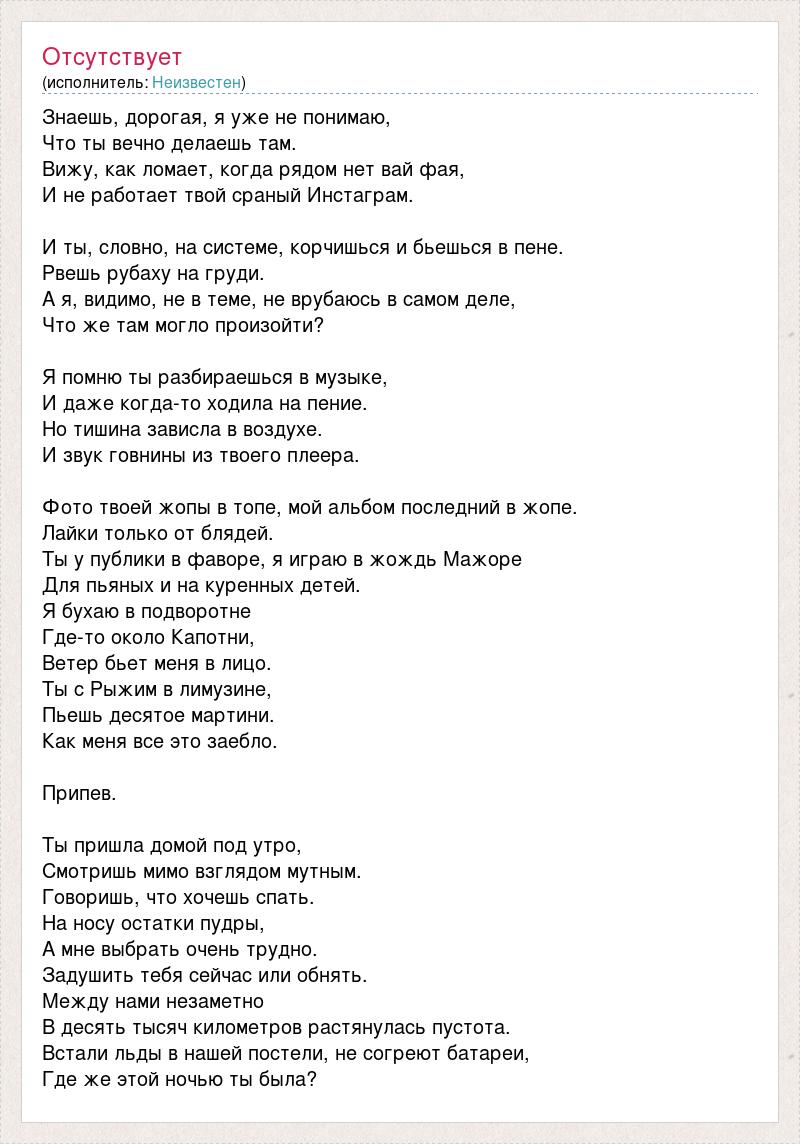 Знаешь, дорогая, я уже не понимаю, Что ты вечно делаешь там. Вижу, как ломает, когда рядом нет вай фая, И не работает твой сраный Инстаграм. И ты, словно, на системе, корчишься и бьешься в пене. Рвешь рубаху на груди. А я, видимо, не в теме, не врубаюсь в самом деле, Что же там могло произойти? Я помню ты разбираешься в музыке, И даже когда-то ходила на пение. Но тишина зависла в воздухе. И звук говнины из твоего плеера. Фото твоей жопы в топе, мой альбом последний в жопе. Лайки только от блядей. Ты у публики в фаворе, я играю в жождь Мажоре Для пьяных и на куренных детей. Я бухаю в подворотне Где-то около Капотни, Ветер бьет меня в лицо. Ты с Рыжим в лимузине, Пьешь десятое мартини. Как меня все это заебло. Припев. Ты пришла домой под утро, Смотришь мимо взглядом мутным. Говоришь, что хочешь спать. На носу остатки пудры, А мне выбрать очень трудно. Задушить тебя сейчас или обнять. Между нами незаметно В десять тысяч километров растянулась пустота. Встали льды в нашей постели, не согреют батареи, Где же этой ночью ты была?