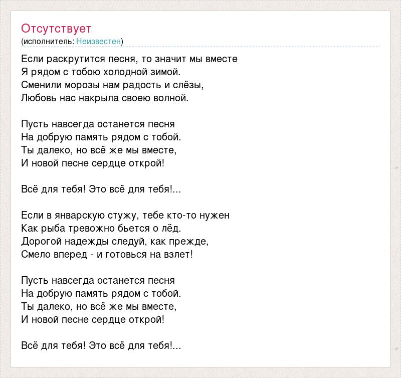 Если раскрутится песня, то значит мы вместе Я рядом с тобою холодной зимой. Сменили морозы нам радость и слёзы, Любовь нас накрыла своею волной. Пусть навсегда останется песня На добрую память рядом с тобой. Ты далеко, но всё же мы вместе, И новой песне сердце открой! Всё для тебя! Это всё для тебя!... Если в январскую стужу, тебе кто-то нужен Как рыба тревожно бьется о лёд. Дорогой надежды следуй, как прежде, Смело вперед - и готовься на взлет! Пусть навсегда останется песня На добрую память рядом с тобой. Ты далеко, но всё же мы вместе, И новой песне сердце открой! Всё для тебя! Это всё для тебя!...