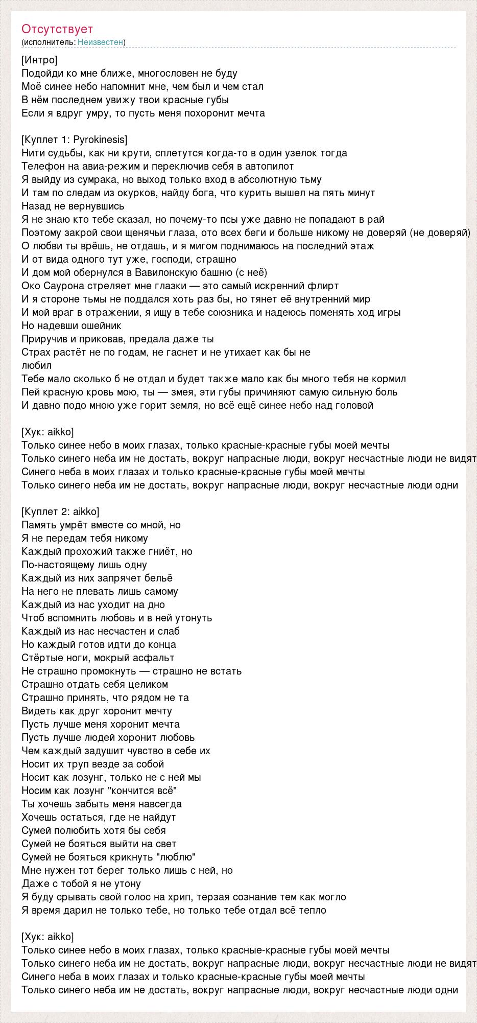 [Интро] Подойди ко мне ближе, многословен не буду Моё синее небо напомнит мне, чем был и чем стал В нём последнем увижу твои красные губы Если я вдруг умру, то пусть меня похоронит мечта [Куплет 1: Pyrokinesis] Нити судьбы, как ни крути, сплетутся когда-то в один узелок тогда Телефон на авиа-режим и переключив себя в автопилот Я выйду из сумрака, но выход только вход в абсолютную тьму И там по следам из окурков, найду бога, что курить вышел на пять минут Назад не вернувшись Я не знаю кто тебе сказал, но почему-то псы уже давно не попадают в рай Поэтому закрой свои щенячьи глаза, ото всех беги и больше никому не доверяй (не доверяй) О любви ты врёшь, не отдашь, и я мигом поднимаюсь на последний этаж И от вида одного тут уже, господи, страшно И дом мой обернулся в Вавилонскую башню (с неё) Око Саурона стреляет мне глазки — это самый искренний флирт И я стороне тьмы не поддался хоть раз бы, но тянет её внутренний мир И мой враг в отражении, я ищу в тебе союзника и надеюсь поменять ход игры Но надевши ошейник Приручив и приковав, предала даже ты Страх растёт не по годам, не гаснет и не утихает как бы не любил Тебе мало сколько б не отдал и будет также мало как бы много тебя не кормил Пей красную кровь мою, ты — змея, эти губы причиняют самую сильную боль И давно подо мною уже горит земля, но всё ещё синее небо над головой [Хук: aikko] Только синее небо в моих глазах, только красные-красные губы моей мечты Только синего неба им не достать, вокруг напрасные люди, вокруг несчастные люди не видят Синего неба в моих глазах и только красные-красные губы моей мечты Только синего неба им не достать, вокруг напрасные люди, вокруг несчастные люди одни [Куплет 2: aikko] Память умрёт вместе со мной, но Я не передам тебя никому Каждый прохожий также гниёт, но По-настоящему лишь одну Каждый из них запрячет бельё На него не плевать лишь самому Каждый из нас уходит на дно Чтоб вспомнить любовь и в ней утонуть Каждый из нас несчастен и слаб Но каждый готов идти до конца Стёртые ноги, мокрый асфальт Не страшно промокнуть — страшно не встать Страшно отдать себя целиком Страшно принять, что рядом не та Видеть как друг хоронит мечту Пусть лучше меня хоронит мечта Пусть лучше людей хоронит любовь Чем каждый задушит чувство в себе их Носит их труп везде за собой Носит как лозунг, только не с ней мы Носим как лозунг "кончится всё" Ты хочешь забыть меня навсегда Хочешь остаться, где не найдут Сумей полюбить хотя бы себя Сумей не бояться выйти на свет Сумей не бояться крикнуть "люблю" Мне нужен тот берег только лишь с ней, но Даже с тобой я не утону Я буду срывать свой голос на хрип, терзая сознание тем как могло Я время дарил не только тебе, но только тебе отдал всё тепло [Хук: aikko] Только синее небо в моих глазах, только красные-красные губы моей мечты Только синего неба им не достать, вокруг напрасные люди, вокруг несчастные люди не видят Синего неба в моих глазах и только красные-красные губы моей мечты Только синего неба им не достать, вокруг напрасные люди, вокруг несчастные люди одни