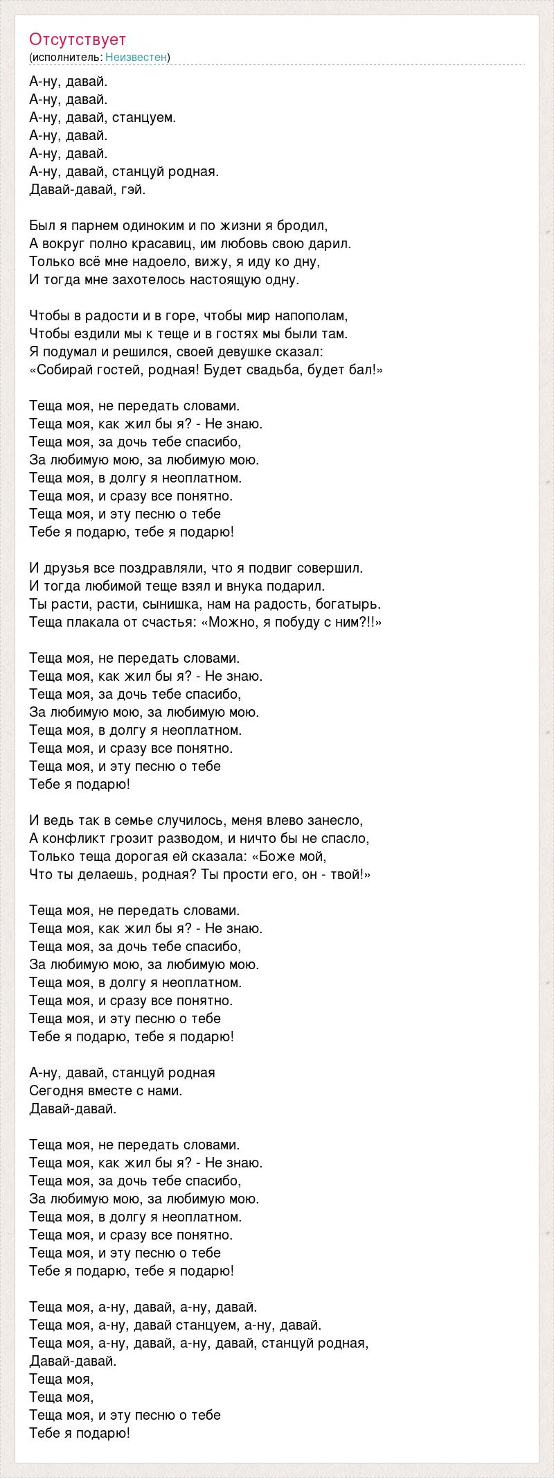 А-ну, давай. А-ну, давай. А-ну, давай, станцуем. А-ну, давай. А-ну, давай. А-ну, давай, станцуй родная. Давай-давай, гэй. Был я парнем одиноким и по жизни я бродил, А вокруг полно красавиц, им любовь свою дарил. Только всё мне надоело, вижу, я иду ко дну, И тогда мне захотелось настоящую одну. Чтобы в радости и в горе, чтобы мир напополам, Чтобы ездили мы к теще и в гостях мы были там. Я подумал и решился, своей девушке сказал: «Собирай гостей, родная! Будет свадьба, будет бал!» Теща моя, не передать словами. Теща моя, как жил бы я? - Не знаю. Теща моя, за дочь тебе спасибо, За любимую мою, за любимую мою. Теща моя, в долгу я неоплатном. Теща моя, и сразу все понятно. Теща моя, и эту песню о тебе Тебе я подарю, тебе я подарю! И друзья все поздравляли, что я подвиг совершил. И тогда любимой теще взял и внука подарил. Ты расти, расти, сынишка, нам на радость, богатырь. Теща плакала от счастья: «Можно, я побуду с ним?!!» Теща моя, не передать словами. Теща моя, как жил бы я? - Не знаю. Теща моя, за дочь тебе спасибо, За любимую мою, за любимую мою. Теща моя, в долгу я неоплатном. Теща моя, и сразу все понятно. Теща моя, и эту песню о тебе Тебе я подарю! И ведь так в семье случилось, меня влево занесло, А конфликт грозит разводом, и ничто бы не спасло, Только теща дорогая ей сказала: «Боже мой, Что ты делаешь, родная? Ты прости его, он - твой!» Теща моя, не передать словами. Теща моя, как жил бы я? - Не знаю. Теща моя, за дочь тебе спасибо, За любимую мою, за любимую мою. Теща моя, в долгу я неоплатном. Теща моя, и сразу все понятно. Теща моя, и эту песню о тебе Тебе я подарю, тебе я подарю! А-ну, давай, станцуй родная Сегодня вместе с нами. Давай-давай. Теща моя, не передать словами. Теща моя, как жил бы я? - Не знаю. Теща моя, за дочь тебе спасибо, За любимую мою, за любимую мою. Теща моя, в долгу я неоплатном. Теща моя, и сразу все понятно. Теща моя, и эту песню о тебе Тебе я подарю, тебе я подарю! Теща моя, а-ну, давай, а-ну, давай. Теща моя, а-ну, давай станцуем, а-ну, давай. Теща моя, а-ну, давай, а-ну, давай, станцуй родная, Давай-давай. Теща моя, Теща моя, Теща моя, и эту песню о тебе Тебе я подарю!
