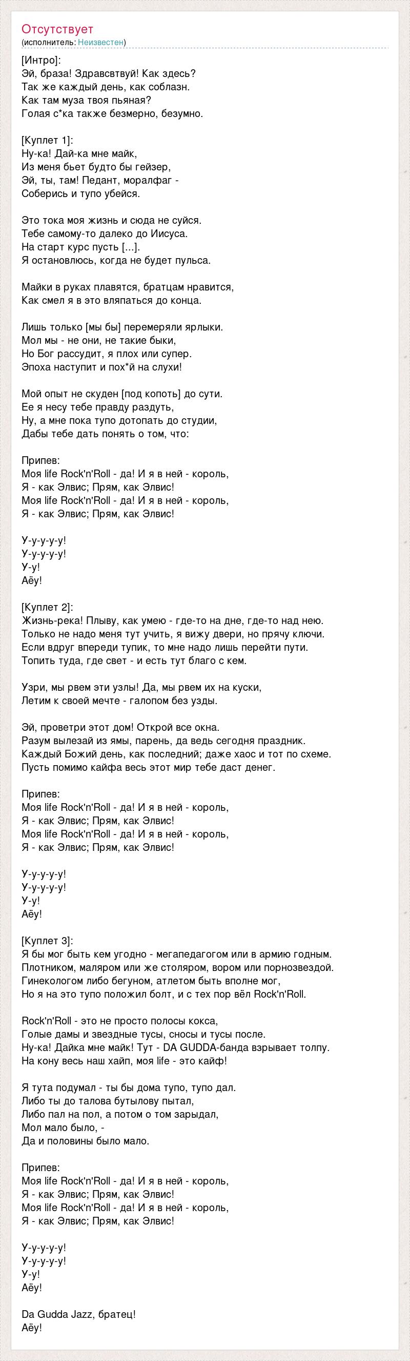 [Интро]: Эй, браза! Здравсвтвуй! Как здесь? Так же каждый день, как соблазн. Как там муза твоя пьяная? Голая с*ка также безмерно, безумно. [Куплет 1]: Ну-ка! Дай-ка мне майк, Из меня бьет будто бы гейзер, Эй, ты, там! Педант, моралфаг - Соберись и тупо убейся. Это тока моя жизнь и сюда не суйся. Тебе самому-то далеко до Иисуса. На старт курс пусть [...]. Я остановлюсь, когда не будет пульса. Майки в руках плавятся, братцам нравится, Как смел я в это вляпаться до конца. Лишь только [мы бы] перемеряли ярлыки. Мол мы - не они, не такие быки, Но Бог рассудит, я плох или супер. Эпоха наступит и пох*й на слухи! Мой опыт не скуден [под копоть] до сути. Ее я несу тебе правду раздуть, Ну, а мне пока тупо дотопать до студии, Дабы тебе дать понять о том, что: Припев: Моя life Rock'n'Roll - да! И я в ней - король, Я - как Элвис; Прям, как Элвис! Моя life Rock'n'Roll - да! И я в ней - король, Я - как Элвис; Прям, как Элвис! У-у-у-у-у! У-у-у-у-у! У-у! Аёу! [Куплет 2]: Жизнь-река! Плыву, как умею - где-то на дне, где-то над нею. Только не надо меня тут учить, я вижу двери, но прячу ключи. Если вдруг впереди тупик, то мне надо лишь перейти пути. Топить туда, где свет - и есть тут благо с кем. Узри, мы рвем эти узлы! Да, мы рвем их на куски, Летим к своей мечте - галопом без узды. Эй, проветри этот дом! Открой все окна. Разум вылезай из ямы, парень, да ведь сегодня праздник. Каждый Божий день, как последний; даже хаос и тот по схеме. Пусть помимо кайфа весь этот мир тебе даст денег. Припев: Моя life Rock'n'Roll - да! И я в ней - король, Я - как Элвис; Прям, как Элвис! Моя life Rock'n'Roll - да! И я в ней - король, Я - как Элвис; Прям, как Элвис! У-у-у-у-у! У-у-у-у-у! У-у! Аёу! [Куплет 3]: Я бы мог быть кем угодно - мегапедагогом или в армию годным. Плотником, маляром или же столяром, вором или порнозвездой. Гинекологом либо бегуном, атлетом быть вполне мог, Но я на это тупо положил болт, и с тех пор вёл Rock'n'Roll. Rock'n'Roll - это не просто полосы кокса, Голые дамы и звездные тусы, сносы и тусы после. Ну-ка! Дайка мне майк! Тут - DA GUDDA-банда взрывает толпу. На кону весь наш хайп, моя life - это кайф! Я тута подумал - ты бы дома тупо, тупо дал. Либо ты до талова бутылову пытал, Либо пал на пол, а потом о том зарыдал, Мол мало было, - Да и половины было мало. Припев: Моя life Rock'n'Roll - да! И я в ней - король, Я - как Элвис; Прям, как Элвис! Моя life Rock'n'Roll - да! И я в ней - король, Я - как Элвис; Прям, как Элвис! У-у-у-у-у! У-у-у-у-у! У-у! Аёу! Da Gudda Jazz, братец! Аёу!