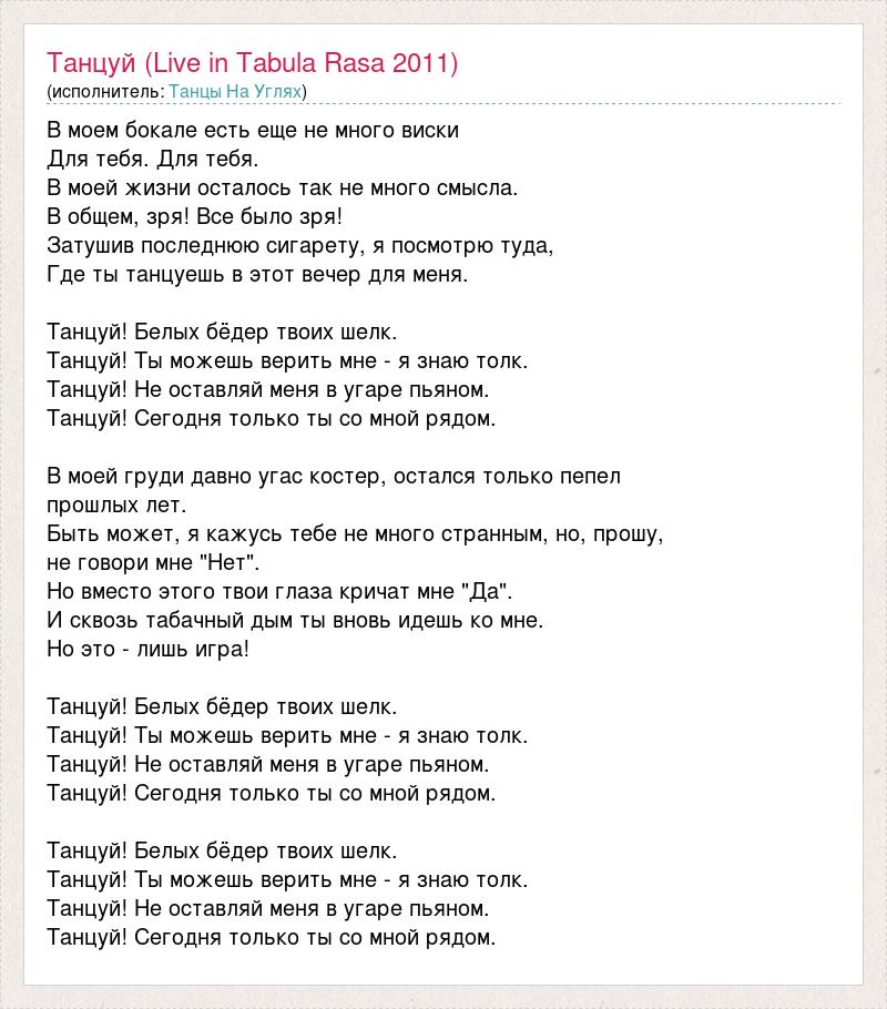 В моем бокале есть еще не много виски Для тебя. Для тебя. В моей жизни осталось так не много смысла. В общем, зря! Все было зря! Затушив последнюю сигарету, я посмотрю туда, Где ты танцуешь в этот вечер для меня. Танцуй! Белых бёдер твоих шелк. Танцуй! Ты можешь верить мне - я знаю толк. Танцуй! Не оставляй меня в угаре пьяном. Танцуй! Сегодня только ты со мной рядом. В моей груди давно угас костер, остался только пепел прошлых лет. Быть может, я кажусь тебе не много странным, но, прошу, не говори мне "Нет". Но вместо этого твои глаза кричат мне "Да". И сквозь табачный дым ты вновь идешь ко мне. Но это - лишь игра! Танцуй! Белых бёдер твоих шелк. Танцуй! Ты можешь верить мне - я знаю толк. Танцуй! Не оставляй меня в угаре пьяном. Танцуй! Сегодня только ты со мной рядом. Танцуй! Белых бёдер твоих шелк. Танцуй! Ты можешь верить мне - я знаю толк. Танцуй! Не оставляй меня в угаре пьяном. Танцуй! Сегодня только ты со мной рядом.