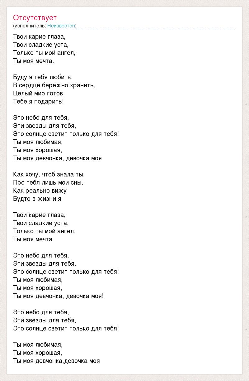Твои карие глаза, Твои сладкие уста, Только ты мой ангел, Ты моя мечта. Буду я тебя любить, В сердце бережно хранить, Целый мир готов Тебе я подарить! Это небо для тебя, Эти звезды для тебя, Это солнце светит только для тебя! Ты моя любимая, Ты моя хорошая, Ты моя девчонка, девочка моя Как хочу, чтоб знала ты, Про тебя лишь мои сны. Как реально вижу Будто в жизни я Твои карие глаза, Твои сладкие уста. Только ты мой ангел, Ты моя мечта. Это небо для тебя, Эти звезды для тебя, Это солнце светит только для тебя! Ты моя любимая, Ты моя хорошая, Ты моя девчонка, девочка моя! Это небо для тебя, Эти звезды для тебя, Это солнце светит только для тебя! Ты моя любимая, Ты моя хорошая, Ты моя девчонка,девочка моя