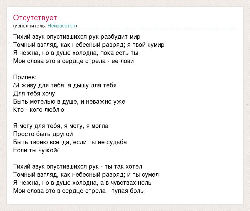 Тихий звук опустившихся рук разбудит мир Томный взгляд, как небесный разряд; я твой кумир Я нежна, но в душе холодна, пока есть ты Мои слова это в сердце стрела - ее лови Припев: /Я живу для тебя, я дышу для тебя Для тебя хочу Быть метелью в душе, и неважно уже Кто - кого люблю Я могу для тебя, я могу, я могла Просто быть другой Быть твоею всегда, если ты не судьба Если ты чужой/ Тихий звук опустившихся рук - ты так хотел Томный взгляд, как небесный разряд; и ты сумел Я нежна, но в душе холодна, а в чувствах ноль Мои слова это в сердце стрела - тупая боль