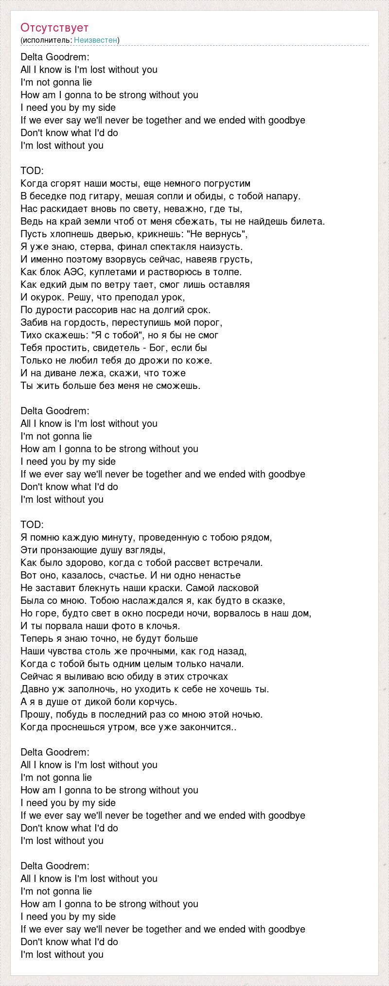 Delta Goodrem: All I know is I'm lost without you I'm not gonna lie How am I gonna to be strong without you I need you by my side If we ever say we'll never be together and we ended with goodbye Don't know what I'd do I'm lost without you TOD: Когда сгорят наши мосты, еще немного погрустим В беседке под гитару, мешая сопли и обиды, с тобой напару. Нас раскидает вновь по свету, неважно, где ты, Ведь на край земли чтоб от меня сбежать, ты не найдешь билета. Пусть хлопнешь дверью, крикнешь: "Не вернусь", Я уже знаю, стерва, финал спектакля наизусть. И именно поэтому взорвусь сейчас, навеяв грусть, Как блок АЭС, куплетами и растворюсь в толпе. Как едкий дым по ветру тает, смог лишь оставляя И окурок. Решу, что преподал урок, По дурости рассорив нас на долгий срок. Забив на гордость, переступишь мой порог, Тихо скажешь: "Я с тобой", но я бы не смог Тебя простить, свидетель - Бог, если бы Только не любил тебя до дрожи по коже. И на диване лежа, скажи, что тоже Ты жить больше без меня не сможешь. Delta Goodrem: All I know is I'm lost without you I'm not gonna lie How am I gonna to be strong without you I need you by my side If we ever say we'll never be together and we ended with goodbye Don't know what I'd do I'm lost without you TOD: Я помню каждую минуту, проведенную с тобою рядом, Эти пронзающие душу взгляды, Как было здорово, когда с тобой рассвет встречали. Вот оно, казалось, счастье. И ни одно ненастье Не заставит блекнуть наши краски. Самой ласковой Была со мною. Тобою наслаждался я, как будто в сказке, Но горе, будто свет в окно посреди ночи, ворвалось в наш дом, И ты порвала наши фото в клочья. Теперь я знаю точно, не будут больше Наши чувства столь же прочными, как год назад, Когда с тобой быть одним целым только начали. Сейчас я выливаю всю обиду в этих строчках Давно уж заполночь, но уходить к себе не хочешь ты. А я в душе от дикой боли корчусь. Прошу, побудь в последний раз со мною этой ночью. Когда проснешься утром, все уже закончится.. Delta Goodrem: All I know is I'm lost without you I'm not gonna lie How am I gonna to be strong without you I need you by my side If we ever say we'll never be together and we ended with goodbye Don't know what I'd do I'm lost without you Delta Goodrem: All I know is I'm lost without you I'm not gonna lie How am I gonna to be strong without you I need you by my side If we ever say we'll never be together and we ended with goodbye Don't know what I'd do I'm lost without you
