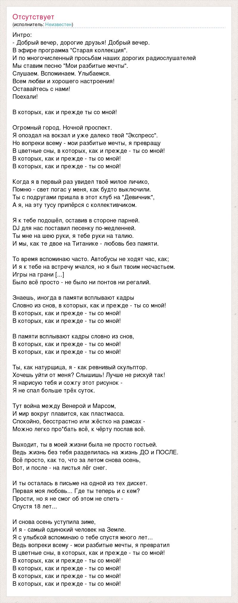 Интро: - Добрый вечер, дорогие друзья! Добрый вечер. В эфире программа "Старая коллекция". И по многочисленный просьбам наших дорогих радиослушателей Мы ставим песню "Мои разбитые мечты". Слушаем. Вспоминаем. Улыбаемся. Всем любви и хорошего настроения! Оставайтесь с нами! Поехали! В которых, как и прежде ты со мной! Огромный город. Ночной проспект. Я опоздал на вокзал и уже далеко твой "Экспресс". Но вопреки всему - мои разбитые мечты, я превращу В цветные сны, в которых, как и прежде - ты со мной! В которых, как и прежде - ты со мной! В которых, как и прежде - ты со мной! Когда я в первый раз увидел твоё милое личико, Помню - свет погас у меня, как будто выключили. Ты с подругами пришла в этот клуб на "Девичник", А я, на эту тусу припёрся с коллективчиком. Я к тебе подошёл, оставив в стороне парней. DJ для нас поставил песенку по-медленней. Ты мне на шею руки, я тебе руки на талию. И мы, как те двое на Титанике - любовь без памяти. То время вспоминаю часто. Автобусы не ходят час, как; И я к тебе на встречу мчался, но я был твоим несчастьем. Игры на грани [...] Было всё просто - не было ни понтов ни регалий. Знаешь, иногда в памяти всплывают кадры Словно из снов, в которых, как и прежде - ты со мной! В которых, как и прежде - ты со мной! В которых, как и прежде - ты со мной! В памяти всплывают кадры словно из снов, В которых, как и прежде - ты со мной! В которых, как и прежде - ты со мной! Ты, как натурщица, я - как ревнивый скульптор. Хочешь уйти от меня? Слышишь! Лучше не рискуй так! Я нарисую тебя и сожгу этот рисунок - Я не спал больше трёх суток. Тут война между Венерой и Марсом, И мир вокруг плавится, как пластмасса. Спокойно, бесстрастно или жёстко на рамсах - Можно легко про*бать всё, к чёрту послав всё. Выходит, ты в моей жизни была не просто гостьей. Ведь жизнь без тебя разделилась на жизнь ДО и ПОСЛЕ. Всё просто, как то, что за летом снова осень, Вот, и после - на листья лёг снег. И ты осталась в письме на одной из тех дискет. Первая моя любовь... Где ты теперь и с кем? Прости, но я не смог об этом не спеть - Спустя 18 лет... И снова осень уступила зиме, И я - самый одинокий человек на Земле. Я с улыбкой вспоминаю о тебе спустя много лет... Ведь вопреки всему - мои разбитые мечты, я превратил В цветные сны, в которых, как и прежде - ты со мной! В которых, как и прежде - ты со мной! В которых, как и прежде - ты со мной! В которых, как и прежде - ты со мной! В которых, как и прежде - ты со мной!