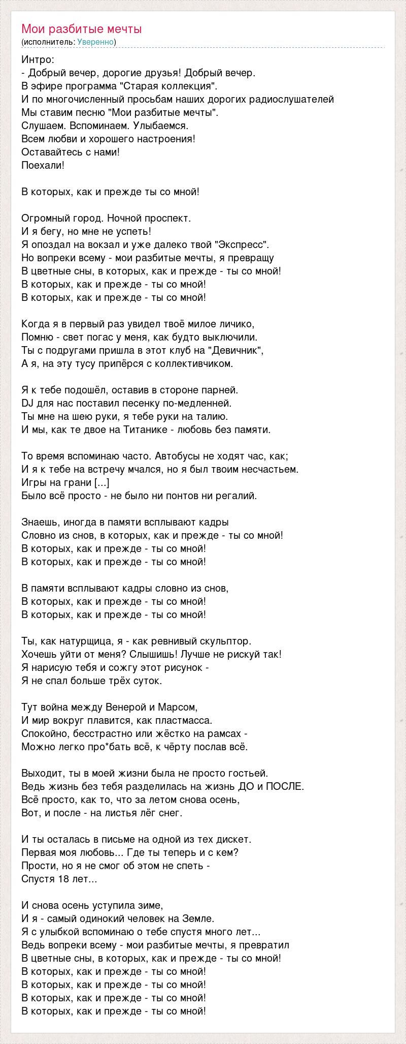 Интро: - Добрый вечер, дорогие друзья! Добрый вечер. В эфире программа "Старая коллекция". И по многочисленный просьбам наших дорогих радиослушателей Мы ставим песню "Мои разбитые мечты". Слушаем. Вспоминаем. Улыбаемся. Всем любви и хорошего настроения! Оставайтесь с нами! Поехали! В которых, как и прежде ты со мной! Огромный город. Ночной проспект. И я бегу, но мне не успеть! Я опоздал на вокзал и уже далеко твой "Экспресс". Но вопреки всему - мои разбитые мечты, я превращу В цветные сны, в которых, как и прежде - ты со мной! В которых, как и прежде - ты со мной! В которых, как и прежде - ты со мной! Когда я в первый раз увидел твоё милое личико, Помню - свет погас у меня, как будто выключили. Ты с подругами пришла в этот клуб на "Девичник", А я, на эту тусу припёрся с коллективчиком. Я к тебе подошёл, оставив в стороне парней. DJ для нас поставил песенку по-медленней. Ты мне на шею руки, я тебе руки на талию. И мы, как те двое на Титанике - любовь без памяти. То время вспоминаю часто. Автобусы не ходят час, как; И я к тебе на встречу мчался, но я был твоим несчастьем. Игры на грани [...] Было всё просто - не было ни понтов ни регалий. Знаешь, иногда в памяти всплывают кадры Словно из снов, в которых, как и прежде - ты со мной! В которых, как и прежде - ты со мной! В которых, как и прежде - ты со мной! В памяти всплывают кадры словно из снов, В которых, как и прежде - ты со мной! В которых, как и прежде - ты со мной! Ты, как натурщица, я - как ревнивый скульптор. Хочешь уйти от меня? Слышишь! Лучше не рискуй так! Я нарисую тебя и сожгу этот рисунок - Я не спал больше трёх суток. Тут война между Венерой и Марсом, И мир вокруг плавится, как пластмасса. Спокойно, бесстрастно или жёстко на рамсах - Можно легко про*бать всё, к чёрту послав всё. Выходит, ты в моей жизни была не просто гостьей. Ведь жизнь без тебя разделилась на жизнь ДО и ПОСЛЕ. Всё просто, как то, что за летом снова осень, Вот, и после - на листья лёг снег. И ты осталась в письме на одной из тех дискет. Первая моя любовь... Где ты теперь и с кем? Прости, но я не смог об этом не спеть - Спустя 18 лет... И снова осень уступила зиме, И я - самый одинокий человек на Земле. Я с улыбкой вспоминаю о тебе спустя много лет... Ведь вопреки всему - мои разбитые мечты, я превратил В цветные сны, в которых, как и прежде - ты со мной! В которых, как и прежде - ты со мной! В которых, как и прежде - ты со мной! В которых, как и прежде - ты со мной! В которых, как и прежде - ты со мной!