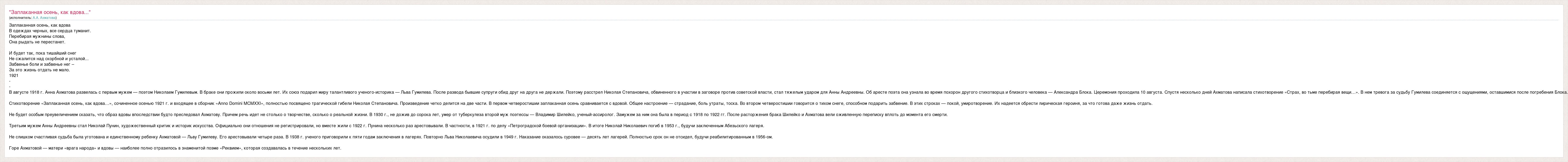 Заплаканная осень, как вдова В одеждах черных, все сердца туманит. Перебирая мужнины слова, Она рыдать не перестанет. И будет так, пока тишайший снег Не сжалится над скорбной и усталой... Забвенье боли и забвенье нег – За это жизнь отдать не мало. 1921 - - В августе 1918 г. Анна Ахматова развелась с первым мужем — поэтом Николаем Гумилевым. В браке они прожили около восьми лет. Их союз подарил миру талантливого ученого-историка — Льва Гумилева. После развода бывшие супруги обид друг на друга не держали. Поэтому расстрел Николая Степановича, обвиненного в участии в заговоре против советской власти, стал тяжелым ударом для Анны Андреевны. Об аресте поэта она узнала во время похорон другого стихотворца и близкого человека — Александра Блока. Церемония проходила 10 августа. Спустя несколько дней Ахматова написала стихотворение «Страх, во тьме перебирая вещи…». В нем тревога за судьбу Гумилева соединяется с ощущениями, оставшимися после погребения Блока. Стихотворение «Заплаканная осень, как вдова…», сочиненное осенью 1921 г. и входящее в сборник «Anno Domini МСМХХI», полностью посвящено трагической гибели Николая Степановича. Произведение четко делится на две части. В первом четверостишии заплаканная осень сравнивается с вдовой. Общее настроение — страдание, боль утраты, тоска. Во втором четверостишии говорится о тихом снеге, способном подарить забвение. В этих строках — покой, умиротворение. Их надеется обрести лирическая героиня, за что готова даже жизнь отдать. Не будет особым преувеличением сказать, что образ вдовы впоследствии будто преследовал Ахматову. Причем речь идет не столько о творчестве, сколько о реальной жизни. В 1930 г., не дожив до сорока лет, умер от туберкулеза второй муж поэтессы — Владимир Шилейко, ученый-ассиролог. Замужем за ним она была в период с 1918 по 1922 гг. После расторжения брака Шилейко и Ахматова вели оживленную переписку вплоть до момента его смерти. Третьим мужем Анны Андреевны стал Николай Пунин, художественный критик и историк искусства. Официально они отношения не регистрировали, но вместе жили с 1922 г. Пунина несколько раз арестовывали. В частности, в 1921 г. по делу «Петроградской боевой организации». В итоге Николай Николаевич погиб в 1953 г., будучи заключенным Абезьского лагеря. Не слишком счастливая судьба была уготована и единственному ребенку Ахматовой — Льву Гумилеву. Его арестовывали четыре раза. В 1938 г. ученого приговорили к пяти годам заключения в лагерях. Повторно Льва Николаевича осудили в 1949 г. Наказание оказалось суровее — десять лет лагерей. Полностью срок он не отсидел, будучи реабилитированным в 1956-ом. Горе Ахматовой — матери «врага народа» и вдовы — наиболее полно отразилось в знаменитой поэме «Реквием», которая создавалась в течение нескольких лет.