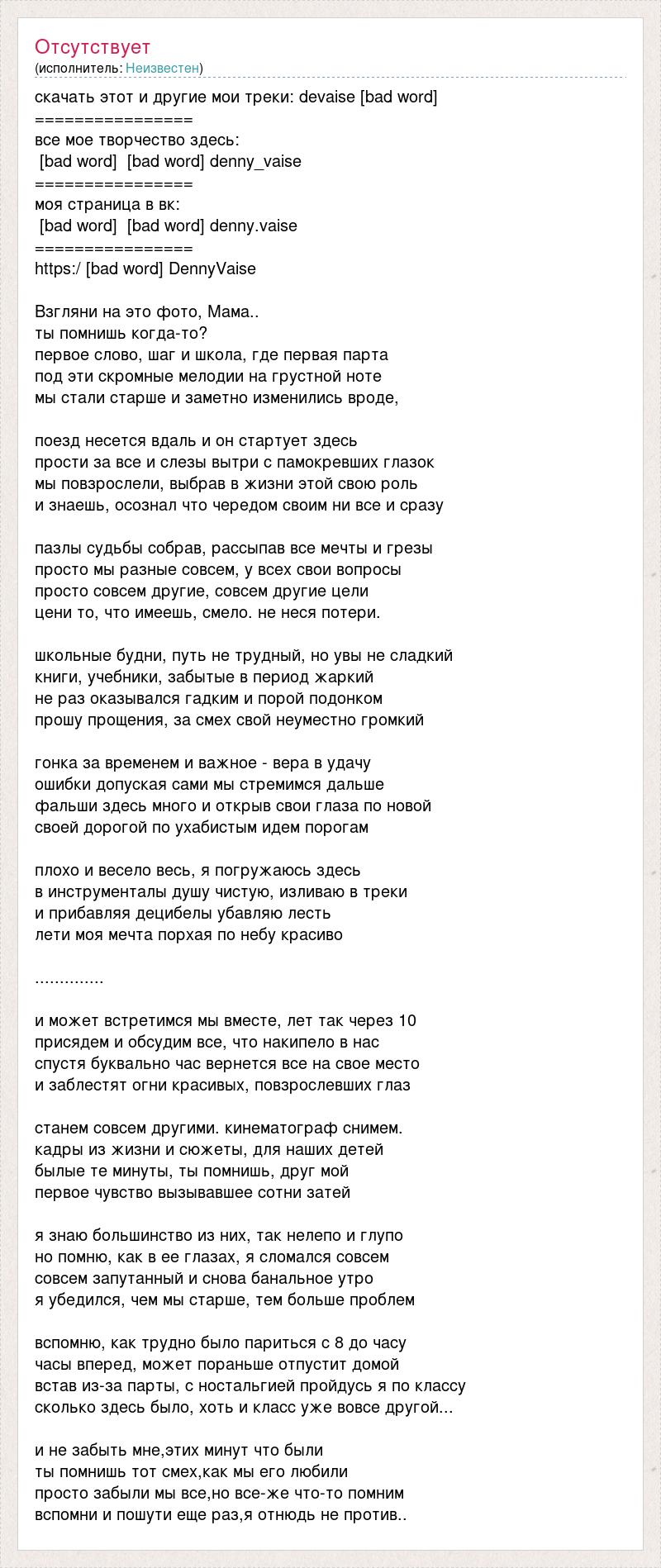 скачать этот и другие мои треки: devaise [bad word] ================ все мое творчество здесь: [bad word] [bad word] denny_vaise ================ моя страница в вк: [bad word] [bad word] denny.vaise ================ https:/ [bad word] DennyVaise Взгляни на это фото, Мама.. ты помнишь когда-то? первое слово, шаг и школа, где первая парта под эти скромные мелодии на грустной ноте мы стали старше и заметно изменились вроде, поезд несется вдаль и он стартует здесь прости за все и слезы вытри с памокревших глазок мы повзрослели, выбрав в жизни этой свою роль и знаешь, осознал что чередом своим ни все и сразу пазлы судьбы собрав, рассыпав все мечты и грезы просто мы разные совсем, у всех свои вопросы просто совсем другие, совсем другие цели цени то, что имеешь, смело. не неся потери. школьные будни, путь не трудный, но увы не сладкий книги, учебники, забытые в период жаркий не раз оказывался гадким и порой подонком прошу прощения, за смех свой неуместно громкий гонка за временем и важное - вера в удачу ошибки допуская сами мы стремимся дальше фальши здесь много и открыв свои глаза по новой своей дорогой по ухабистым идем порогам плохо и весело весь, я погружаюсь здесь в инструменталы душу чистую, изливаю в треки и прибавляя децибелы убавляю лесть лети моя мечта порхая по небу красиво .............. и может встретимся мы вместе, лет так через 10 присядем и обсудим все, что накипело в нас спустя буквально час вернется все на свое место и заблестят огни красивых, повзрослевших глаз станем совсем другими. кинематограф снимем. кадры из жизни и сюжеты, для наших детей былые те минуты, ты помнишь, друг мой первое чувство вызывавшее сотни затей я знаю большинство из них, так нелепо и глупо но помню, как в ее глазах, я сломался совсем совсем запутанный и снова банальное утро я убедился, чем мы старше, тем больше проблем вспомню, как трудно было париться с 8 до часу часы вперед, может пораньше отпустит домой встав из-за парты, с ностальгией пройдусь я по классу сколько здесь было, хоть и класс уже вовсе другой... и не забыть мне,этих минут что были ты помнишь тот смех,как мы его любили просто забыли мы все,но все-же что-то помним вспомни и пошути еще раз,я отнюдь не против..