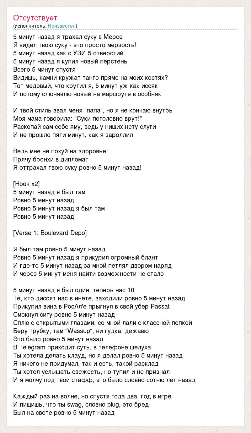 5 минут назад я трахал суку в Мерсе Я видел твою суку - это просто мерзость! 5 минут назад как с УЗИ 5 отверстий 5 минут назад я купил новый перстень Всего 5 минут спустя Видишь, камни кружат танго прямо на моих костях? Тот медовый, что крутил я, 5 минут уж как иссяк И потому слюнявлю новый на маршруте в особняк И твой стиль звал меня "папа", но я не кончаю внутрь Моя мама говорила: "Суки поголовно врут!" Раскопай сам себе яму, ведь у нищих нету слуги И не прошло пяти минут, как я зароллил Ведь мне не похуй на здоровье! Прячу бронхи в дипломат Я оттрахал твою суку ровно 5 минут назад! [Hook x2] 5 минут назад я был там Ровно 5 минут назад Ровно 5 минут назад я был там Ровно 5 минут назад [Verse 1: Boulevard Depo] Я был там ровно 5 минут назад Ровно 5 минут назад я прикурил огромный блант И где-то 5 минут назад за мной петлял двором наряд И через 5 минут меня найти возможности не стало 5 минут назад я был один, теперь нас 10 Те, кто диссят нас в инете, заходили ровно 5 минут назад Прикупил вина в РосАл'е прыгнул в свой убер Passat Смокнул сигу ровно 5 минут назад Сплю с открытыми глазами, со мной лали с классной попкой Беру трубку, там "Wassup", ни гудка, дежавю Это было ровно 5 минут назад В Telegram приходит суть, в телефоне шелуха Ты хотела делать клауд, но я делал ровно 5 минут назад Я ничего не придумал, так и есть, такой расклад Ты хотел услышать свежесть, но тупил и не признал И я молчу под твой стафф, это было словно сотню лет назад Каждый раз на волне, но спустя года два, год в игре И пищишь, что ты swag, словно plug, это бред Был на свете ровно 5 минут назад