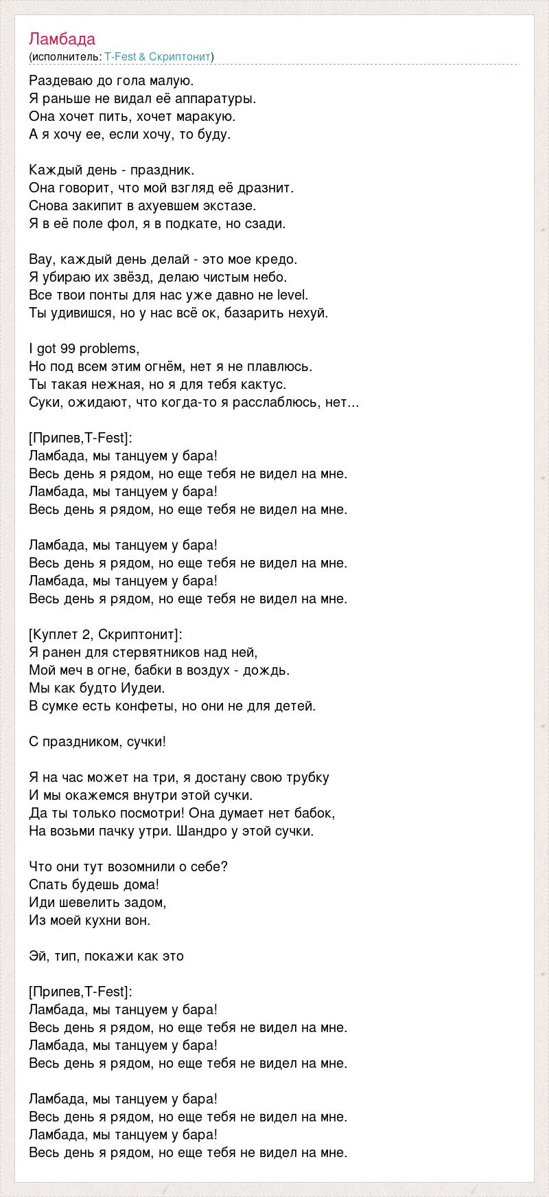 Раздеваю до гола малую. Я раньше не видал её аппаратуры. Она хочет пить, хочет маракую. А я хочу ее, если хочу, то буду. Каждый день - праздник. Она говорит, что мой взгляд её дразнит. Снова закипит в ахуевшем экстазе. Я в её поле фол, я в подкате, но сзади. Вау, каждый день делай - это мое кредо. Я убираю их звёзд, делаю чистым небо. Все твои понты для нас уже давно не level. Ты удивишся, но у нас всё ок, базарить нехуй. I got 99 problems, Но под всем этим огнём, нет я не плавлюсь. Ты такая нежная, но я для тебя кактус. Суки, ожидают, что когда-то я расслаблюсь, нет... [Припев,T-Fest]: Ламбада, мы танцуем у бара! Весь день я рядом, но еще тебя не видел на мне. Ламбада, мы танцуем у бара! Весь день я рядом, но еще тебя не видел на мне. Ламбада, мы танцуем у бара! Весь день я рядом, но еще тебя не видел на мне. Ламбада, мы танцуем у бара! Весь день я рядом, но еще тебя не видел на мне. [Куплет 2, Скриптонит]: Я ранен для стервятников над ней, Мой меч в огне, бабки в воздух - дождь. Мы как будто Иудеи. В сумке есть конфеты, но они не для детей. С праздником, сучки! Я на час может на три, я достану свою трубку И мы окажемся внутри этой сучки. Да ты только посмотри! Она думает нет бабок, На возьми пачку утри. Шандро у этой сучки. Что они тут возомнили о себе? Спать будешь дома! Иди шевелить задом, Из моей кухни вон. Эй, тип, покажи как это [Припев,T-Fest]: Ламбада, мы танцуем у бара! Весь день я рядом, но еще тебя не видел на мне. Ламбада, мы танцуем у бара! Весь день я рядом, но еще тебя не видел на мне. Ламбада, мы танцуем у бара! Весь день я рядом, но еще тебя не видел на мне. Ламбада, мы танцуем у бара! Весь день я рядом, но еще тебя не видел на мне.