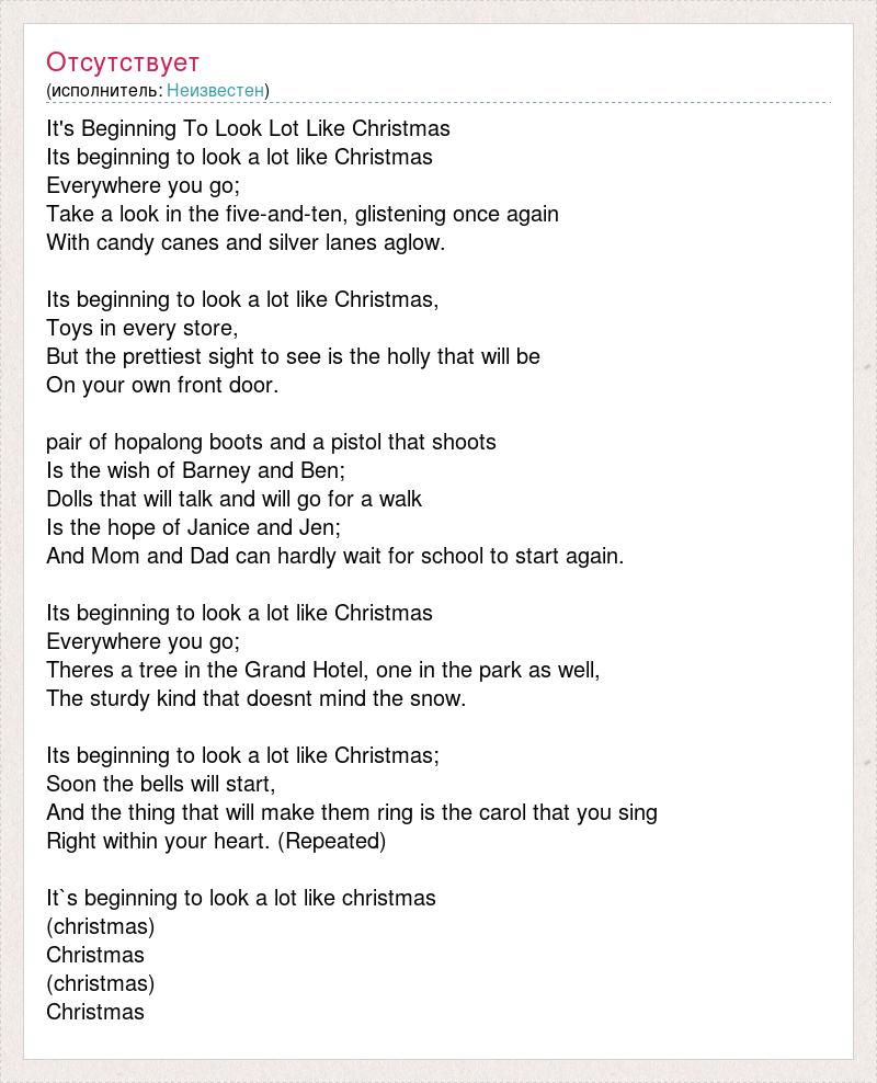 It's Beginning To Look Lot Like Christmas Its beginning to look a lot like Christmas Everywhere you go; Take a look in the five-and-ten, glistening once again With candy canes and silver lanes aglow. Its beginning to look a lot like Christmas, Toys in every store, But the prettiest sight to see is the holly that will be On your own front door. pair of hopalong boots and a pistol that shoots Is the wish of Barney and Ben; Dolls that will talk and will go for a walk Is the hope of Janice and Jen; And Mom and Dad can hardly wait for school to start again. Its beginning to look a lot like Christmas Everywhere you go; Theres a tree in the Grand Hotel, one in the park as well, The sturdy kind that doesnt mind the snow. Its beginning to look a lot like Christmas; Soon the bells will start, And the thing that will make them ring is the carol that you sing Right within your heart. (Repeated) It`s beginning to look a lot like christmas (christmas) Christmas (christmas) Christmas